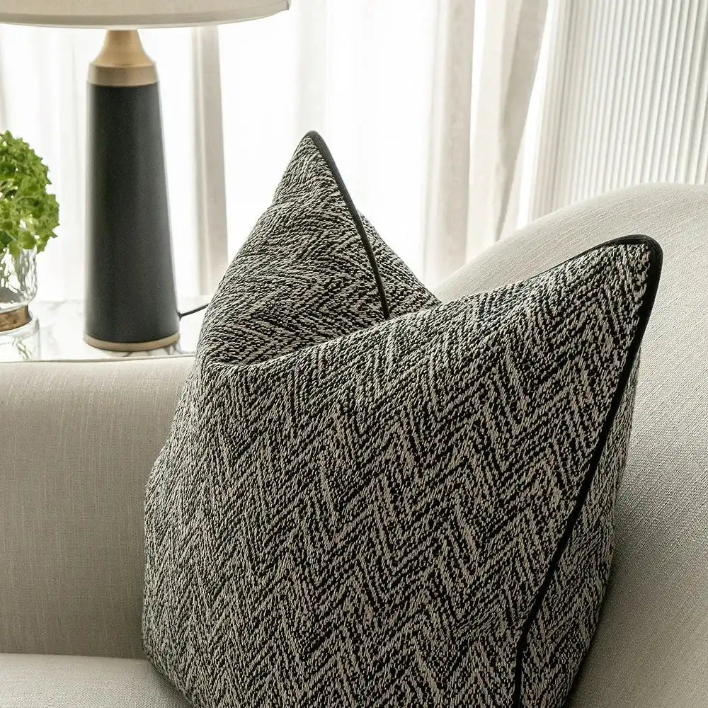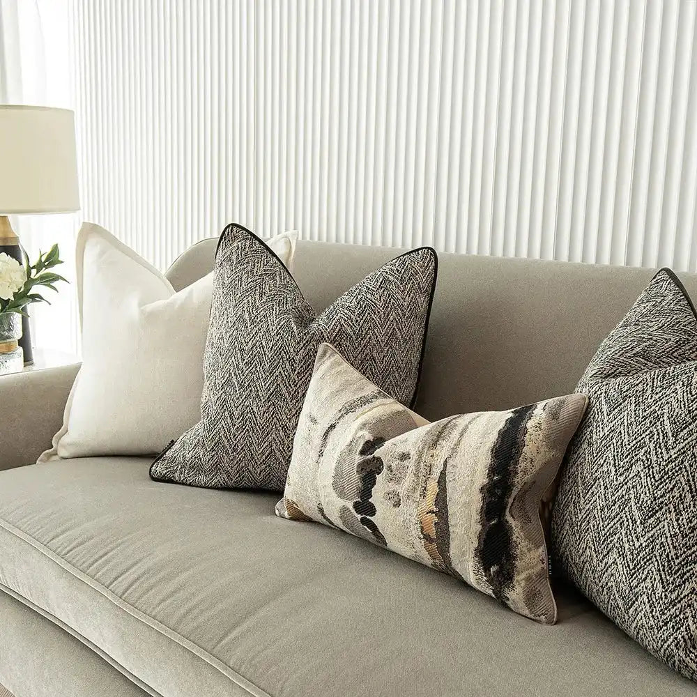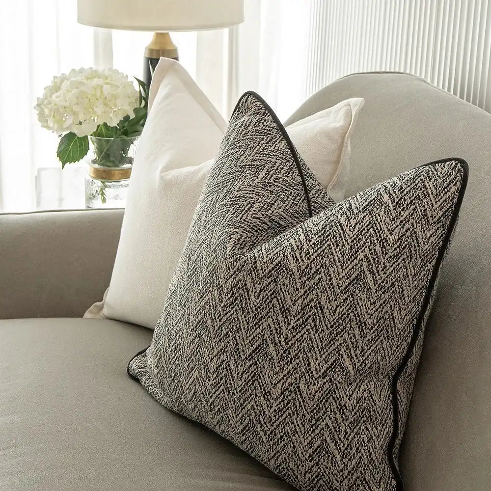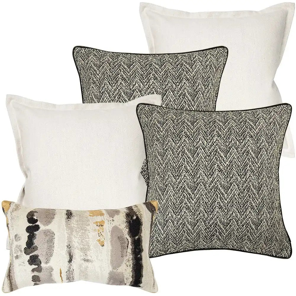 التصميم: وسادتان من نسيج الجاكارد باللون الأبيض، ووسادتان بنمط متعرج باللونين الأسود والأبيض ووسادة بلمسة مجردة