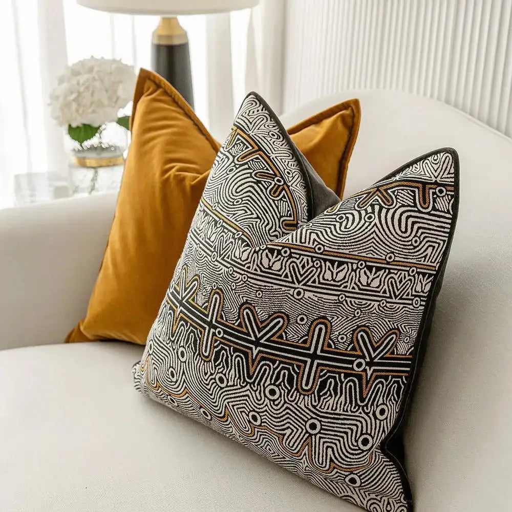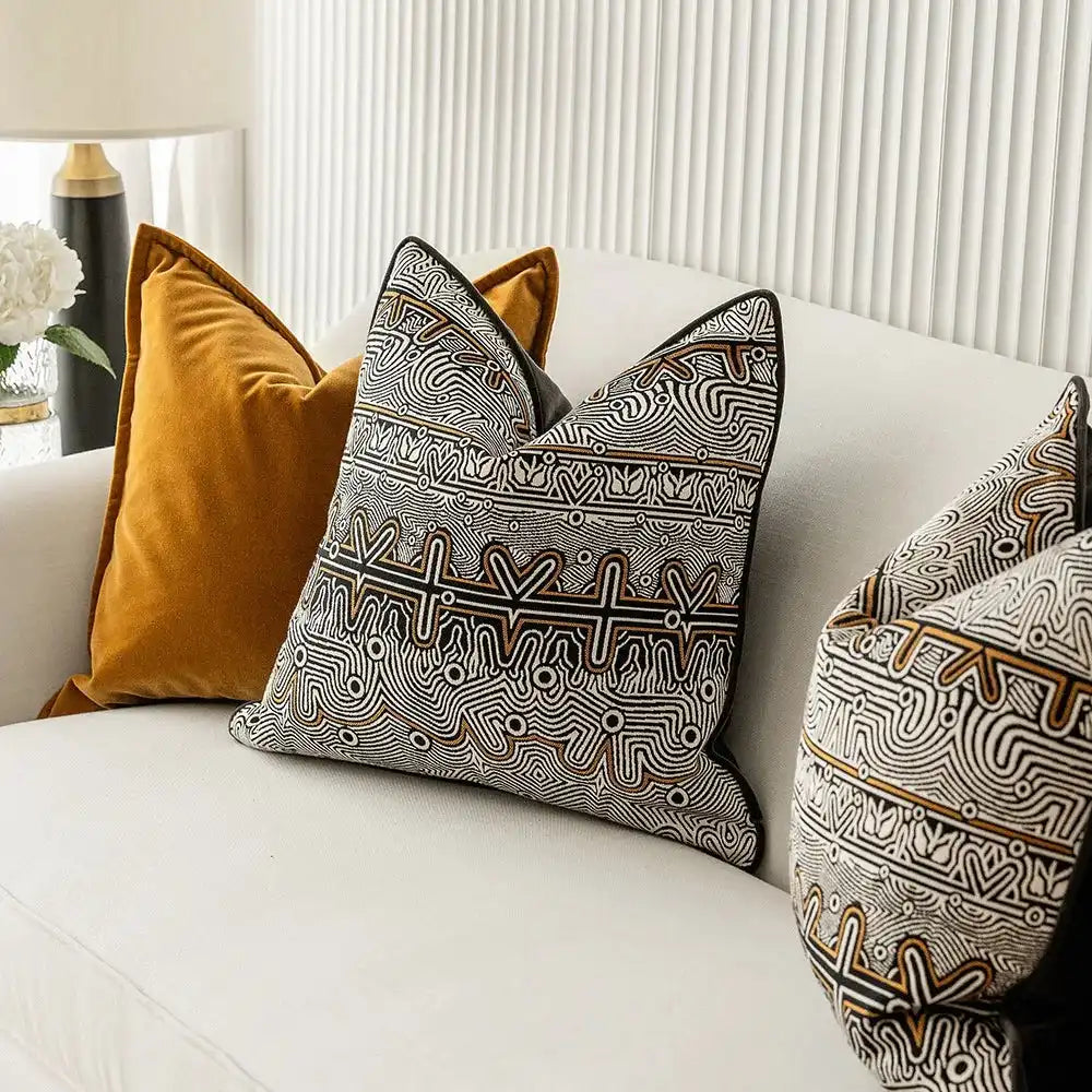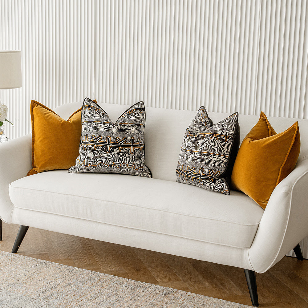 أضف البهجة على غرفة معيشتك مع هذه المجموعة من الوسائد الفخمة. تتضمن وسادتين بنمط مميز باللونين الأسود والأبيض مع لمسات برتقالية