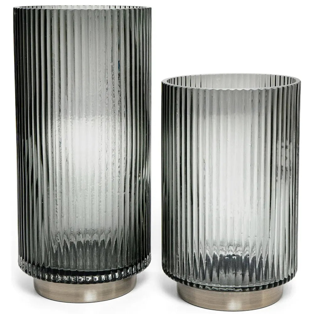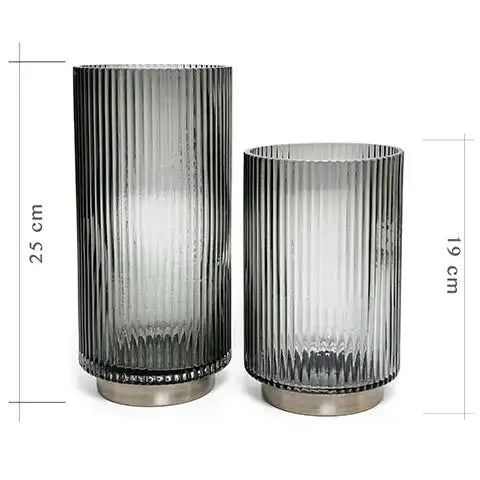 التصميم: مزهريتين من الزجاج والنحاس، بارتفاع 25 سم وارتفاع 19 سم