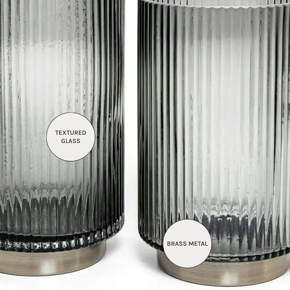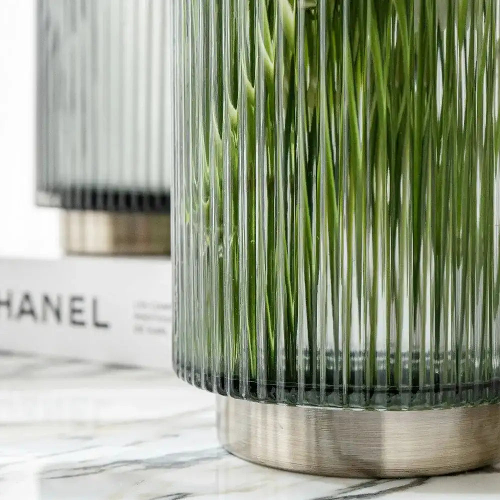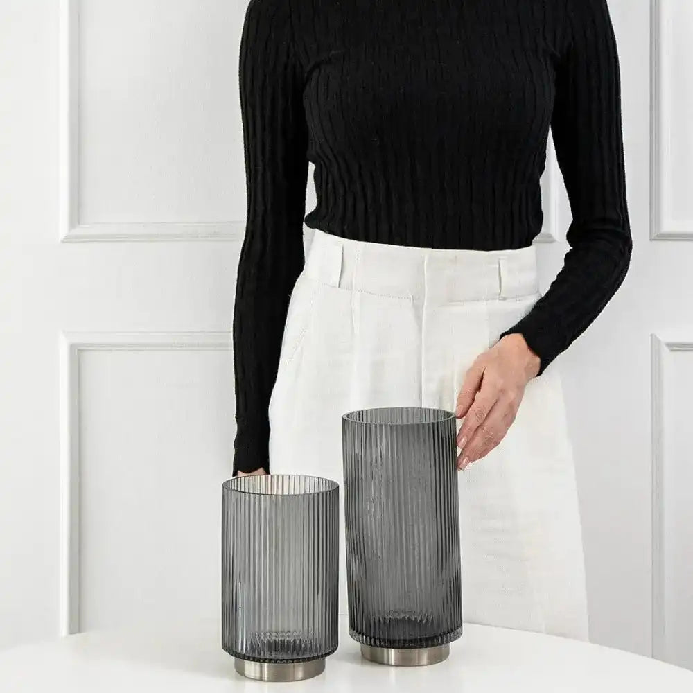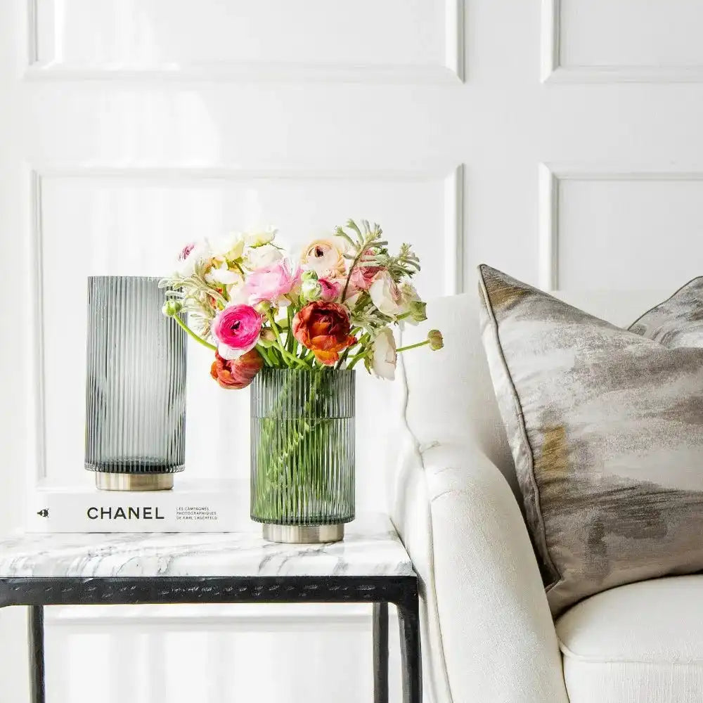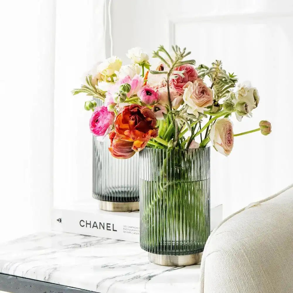 مزهريات من الزجاج بقاعدة نحاسية ستمنح مظهر أنيق في منزلك - سواء ملأتهما بالورود أو تركتهما فارغتين. هذه المجموعة هي الأكثر مبيعًا والمفضلة لدى العملاء.