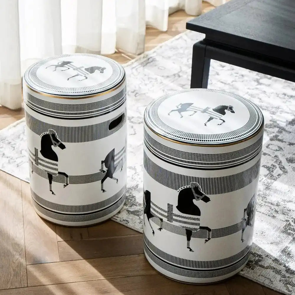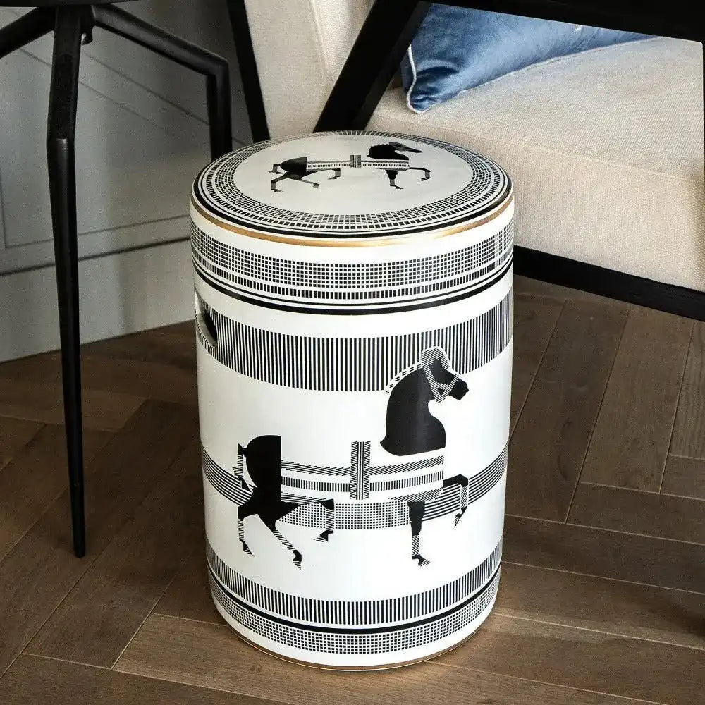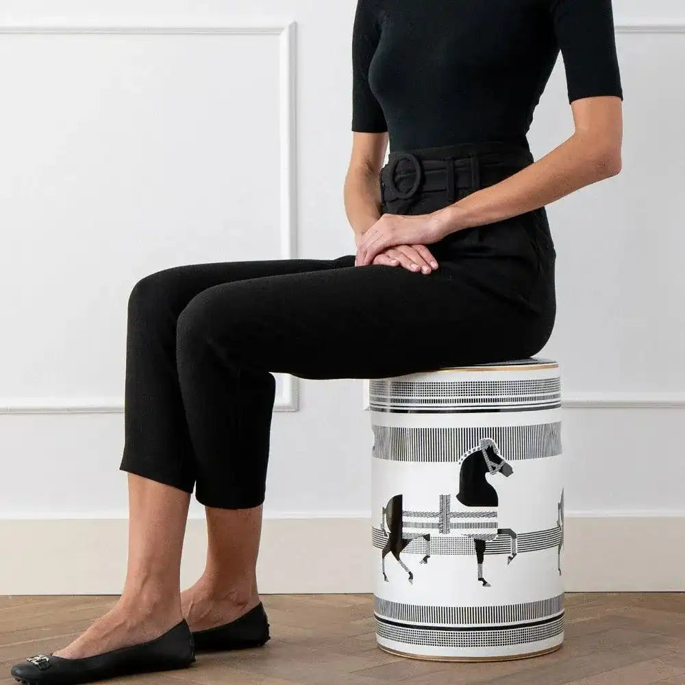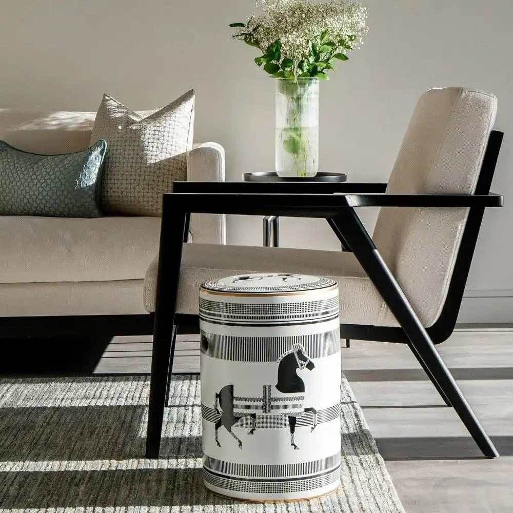 تصميم يمكن استخدامه كطاولة إضافية وإكسسوار رائع ومميز، هذا المقعد المصنوع من البورسلين هو قطعة متعددة الاستخدامات تليق بمنزلك. يأتي باللون الأسود والأبيض، وهو إضافة أنيقة لأي غرفة.