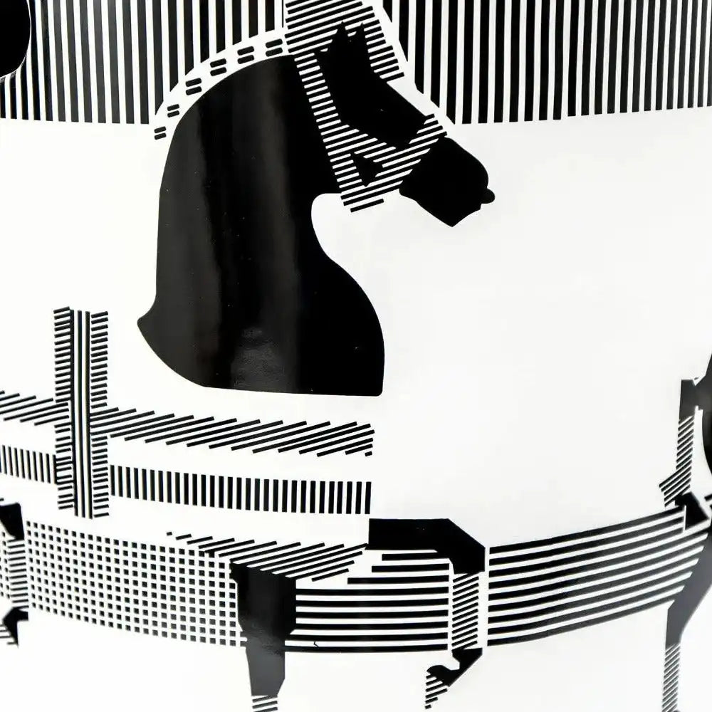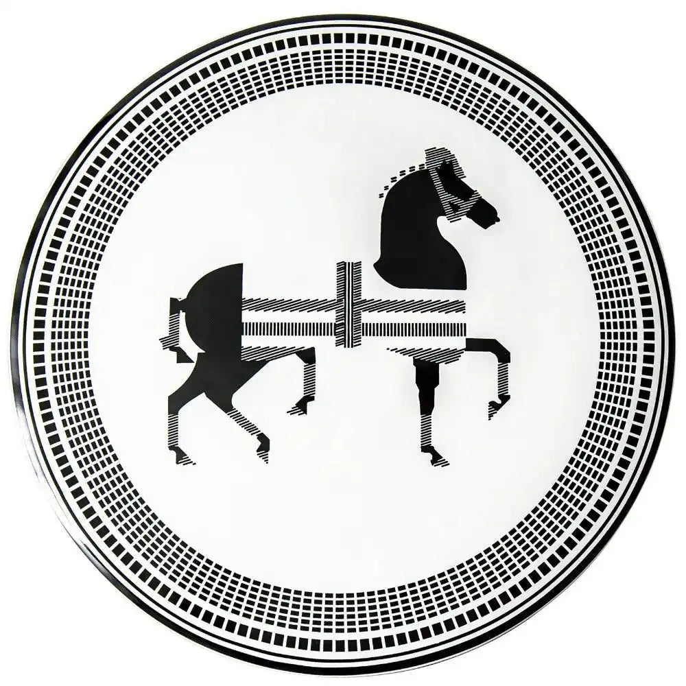 التصميم: مقعد باللونين الأبيض والأسود مع شكل حصان وحواف ذهبية