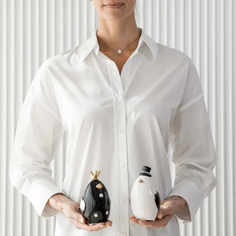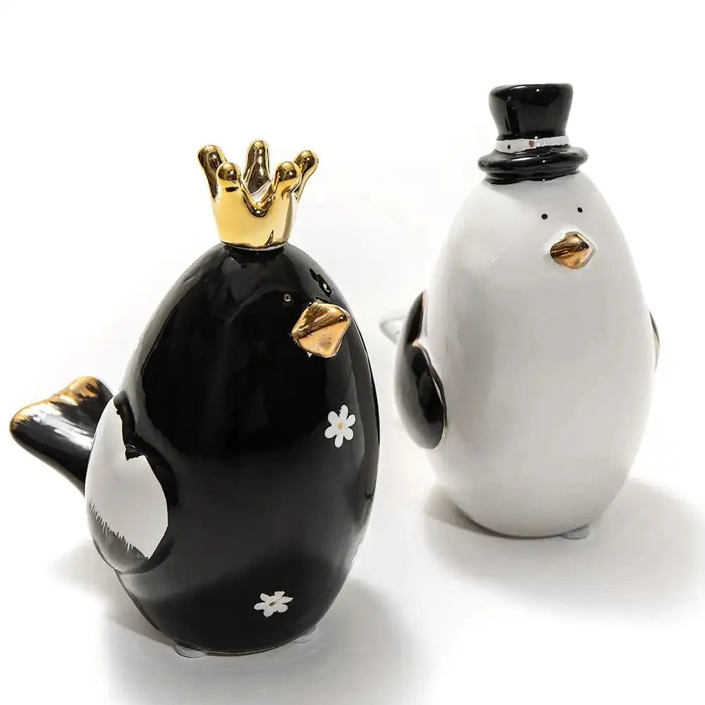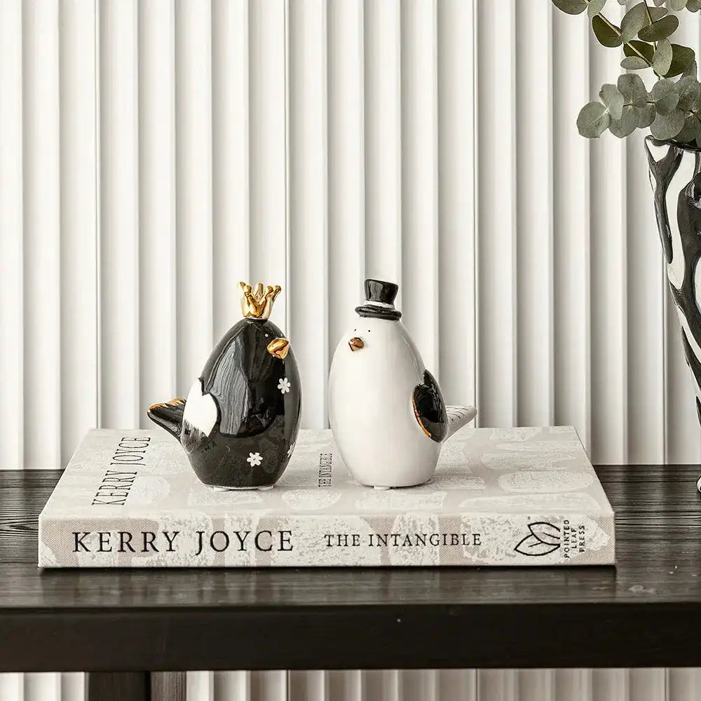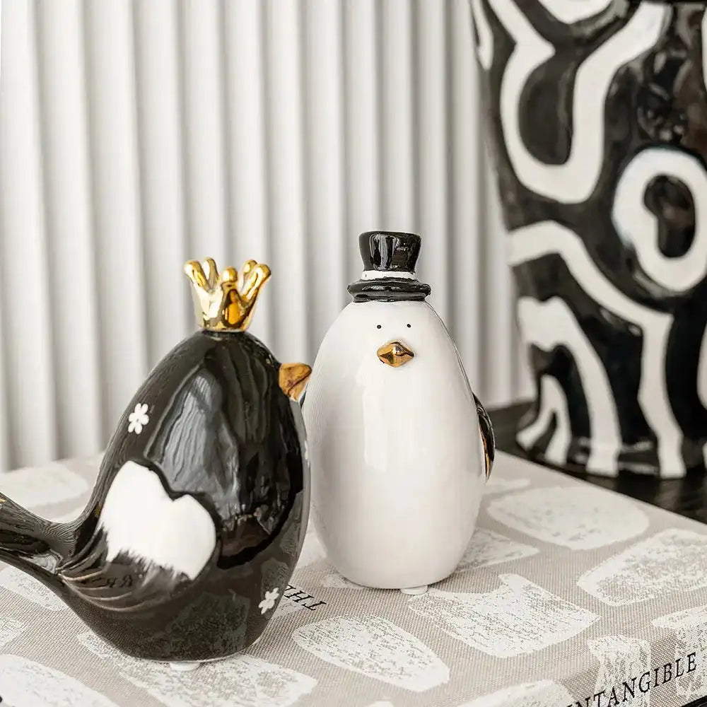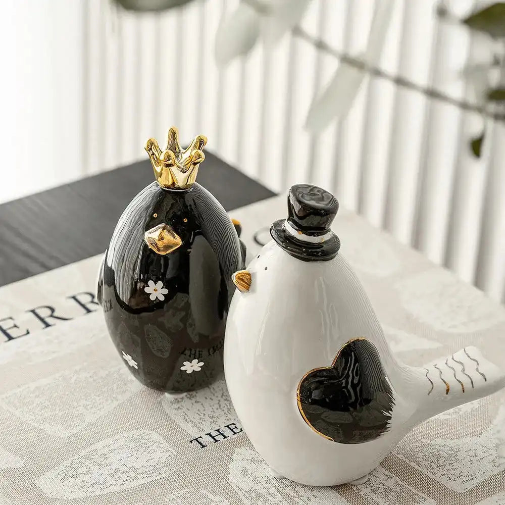 مجموعة طائري الحب السيراميكيين باللون الأسود والأبيض والذهبي. مزينة بقلوب الحب، ستكون هذه الطيور السيراميكية هدية رائعة لحفل زفاف أو خطوبة أو ذكرى سنوية.