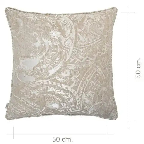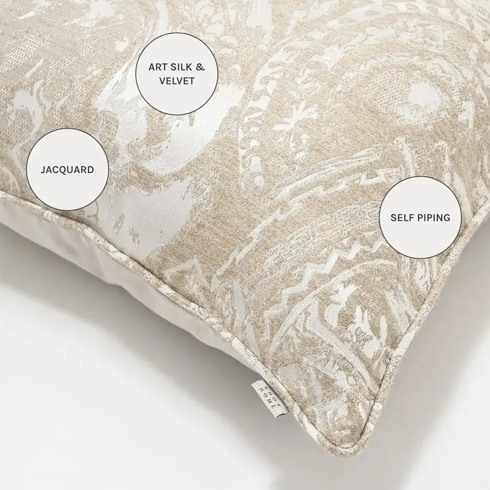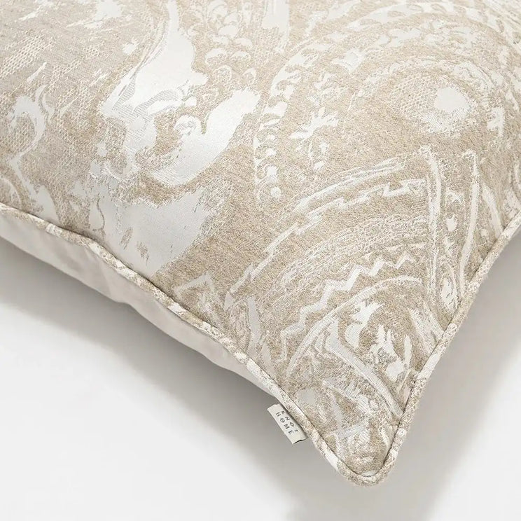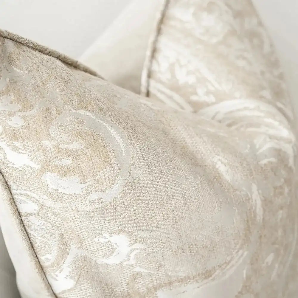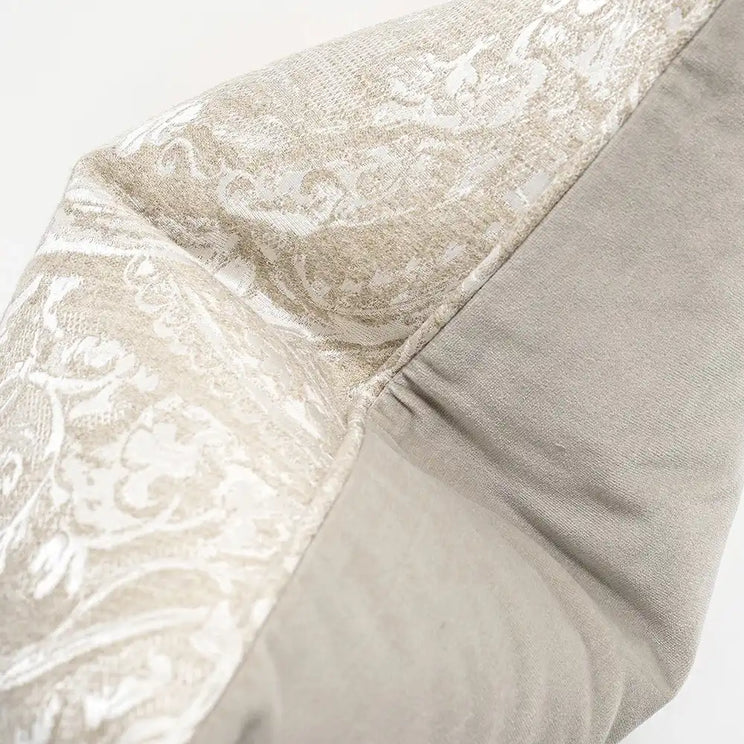 تصميم بنمط لامع وفاخر من الأمام، تعتبر هذه الوسادة البيج والفضية وسيلة سهلة لإضافة لمسة من سحر الفينتاج إلى ديكورك - خليط جميل بين التصميم الكلاسيكي والحديث.