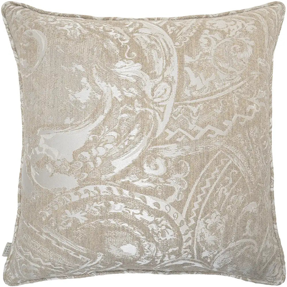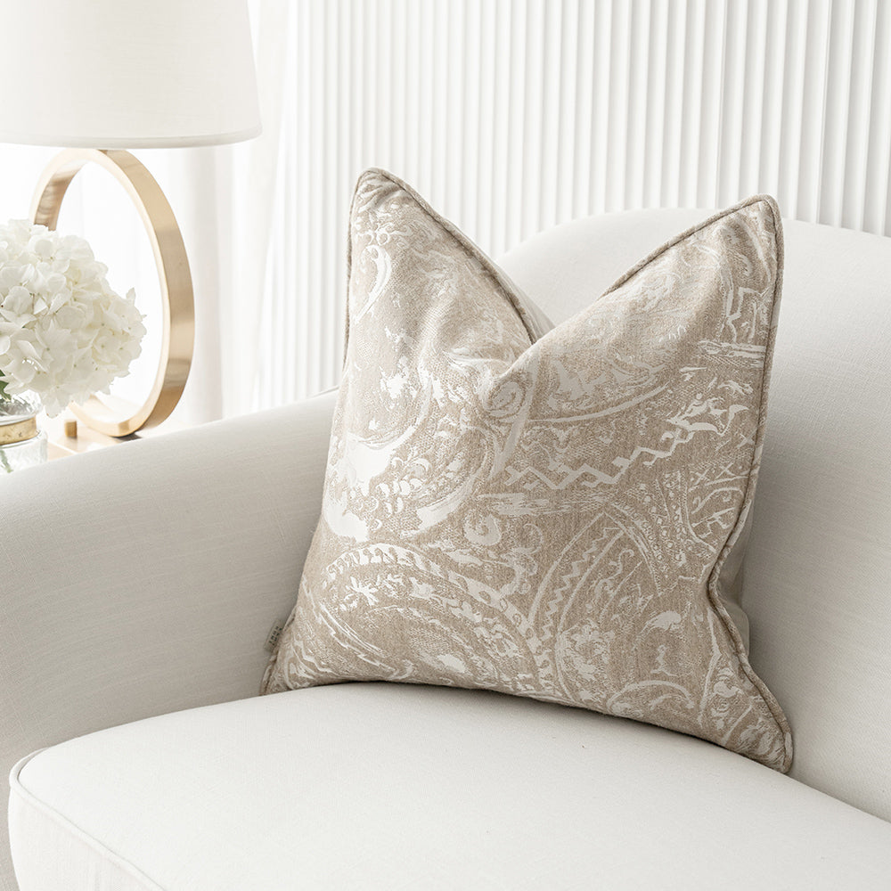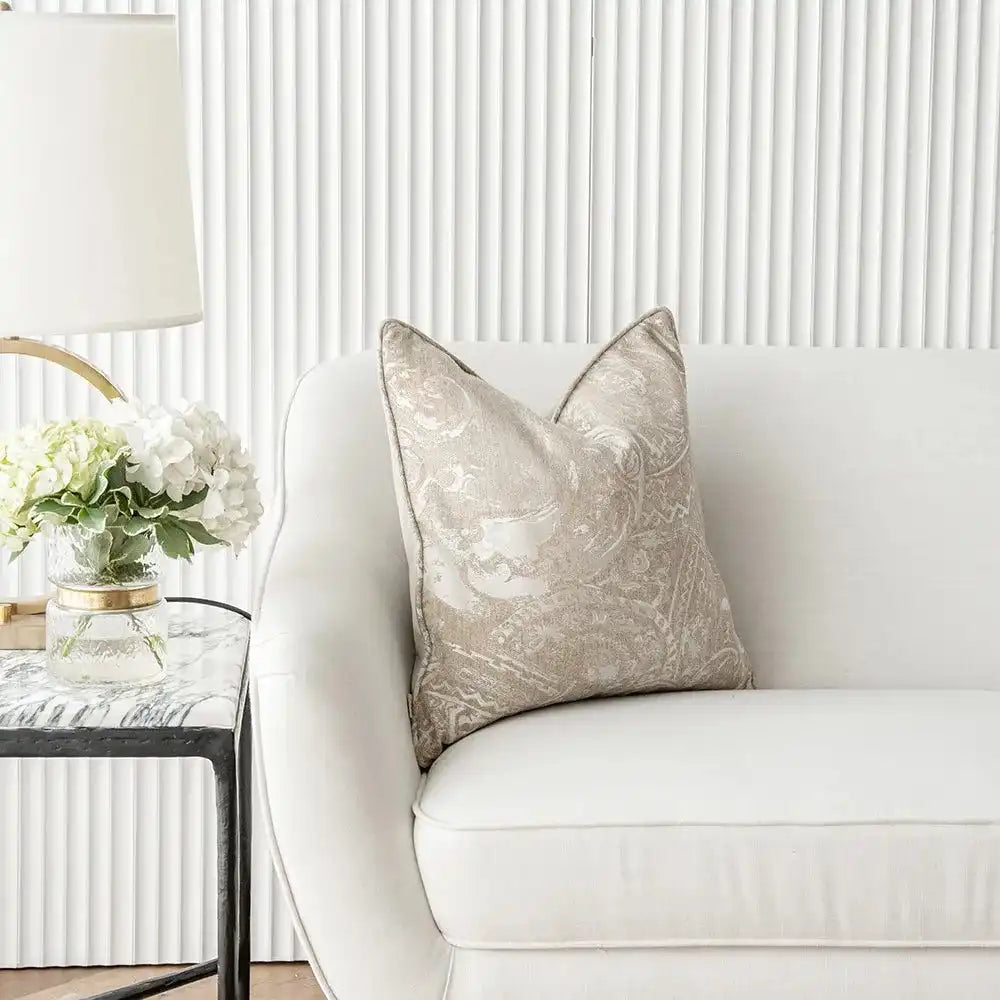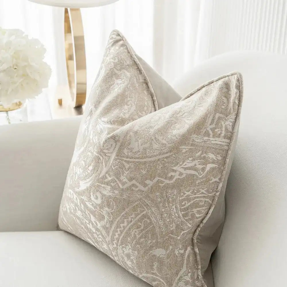 تصميم بنمط لامع وفاخر من الأمام، تعتبر هذه الوسادة البيج والفضية وسيلة سهلة لإضافة لمسة من سحر الفينتاج إلى ديكورك - خليط جميل بين التصميم الكلاسيكي والحديث.
