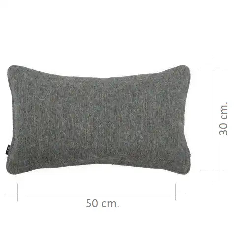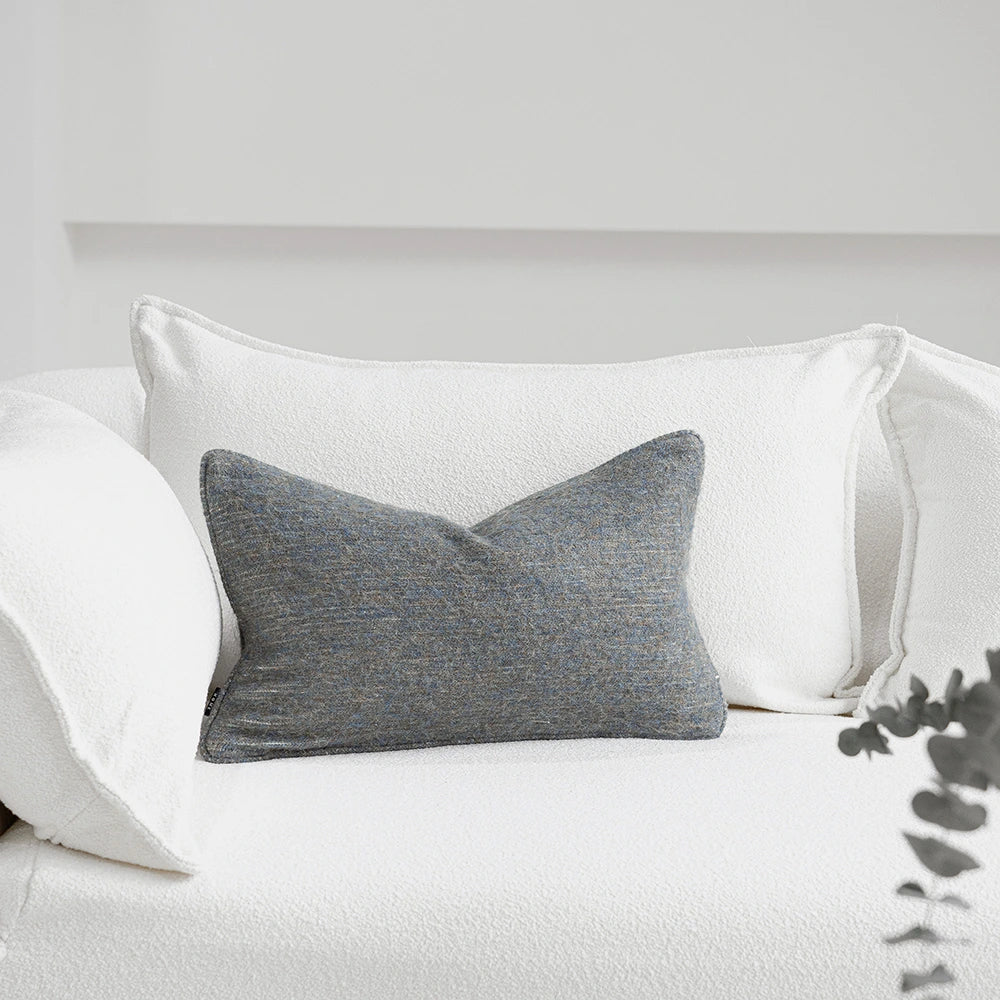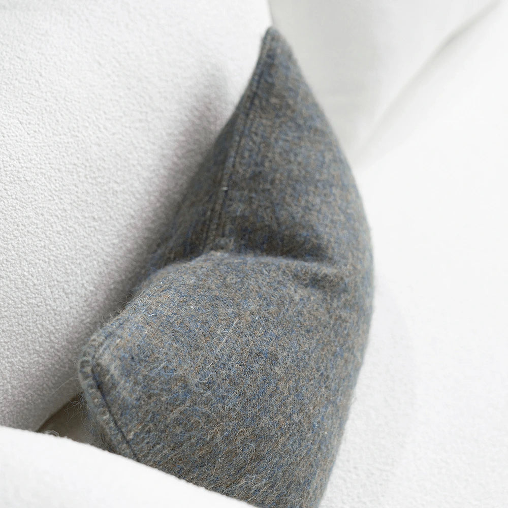 وسادة مصنوعة من مزيج صوف ناعم الملمس، منسوجة بدرجات هادئة من الرمادي الترابي والأزرق الفاتح مع لمسة دافئة خفيفة. يضفي هذا المزيج عمقًا هادئًا وطبيعيًا، مع ملمس دافئ ومريح.