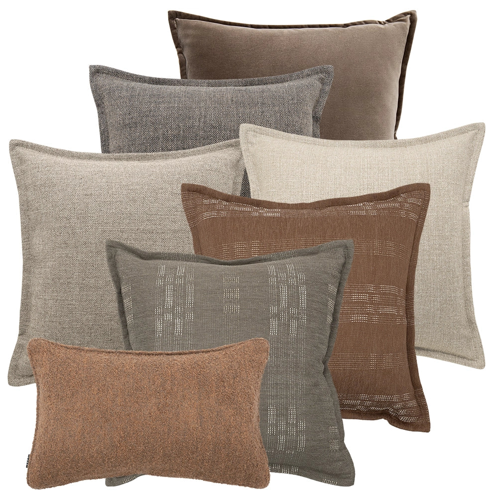 جدّد أريكتك مع مجموعة الوسائد هذه بالألوان الأرضية المميزة. تضم المجموعة سبعة وسائد بدرجات البني والجرافيت والرمادي والبيج الفاتح، مع وسادة مميزة بنسيج تيدي لتمنحك المزيد من الراحة.