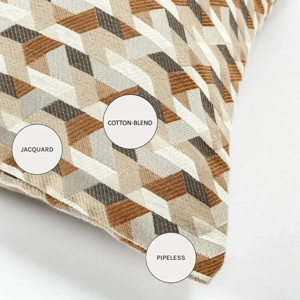 وسادة جاكار هندسية أنيقة بلون عاجي، ورملي فاتح، وبيج فاتح مع فضي، ورمادي محايد، مع لمسة بني. مصنوعة من الحرير الصناعي بلمعان خفيف وحافة مطابقة