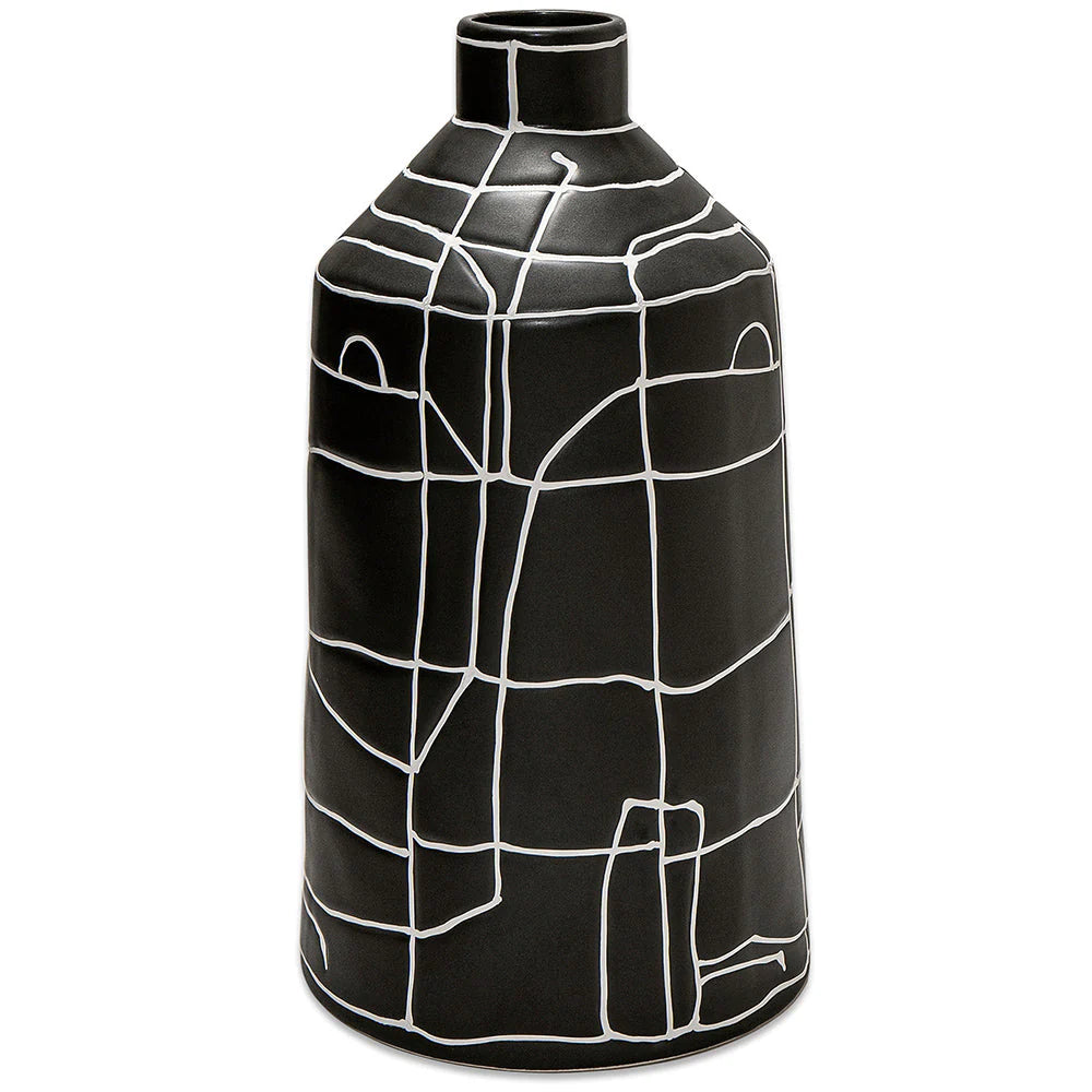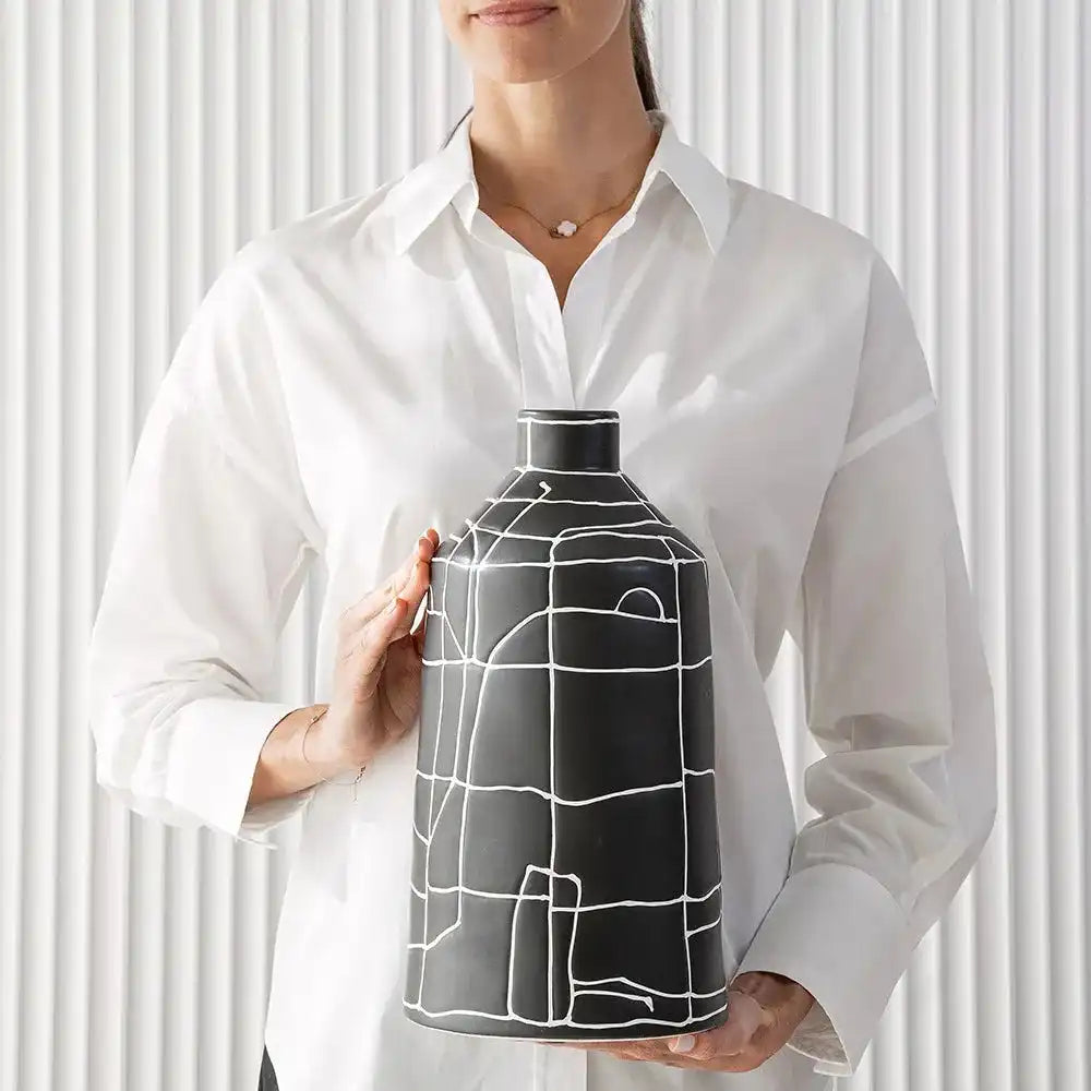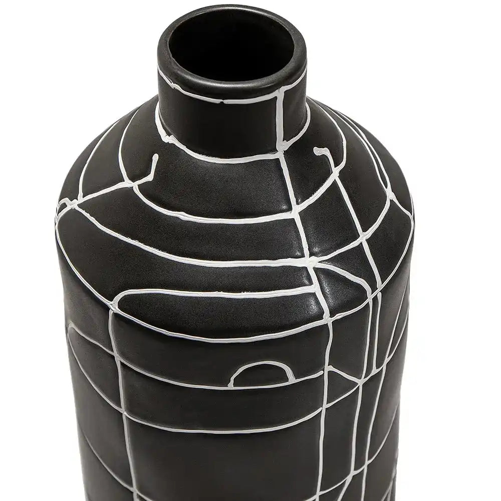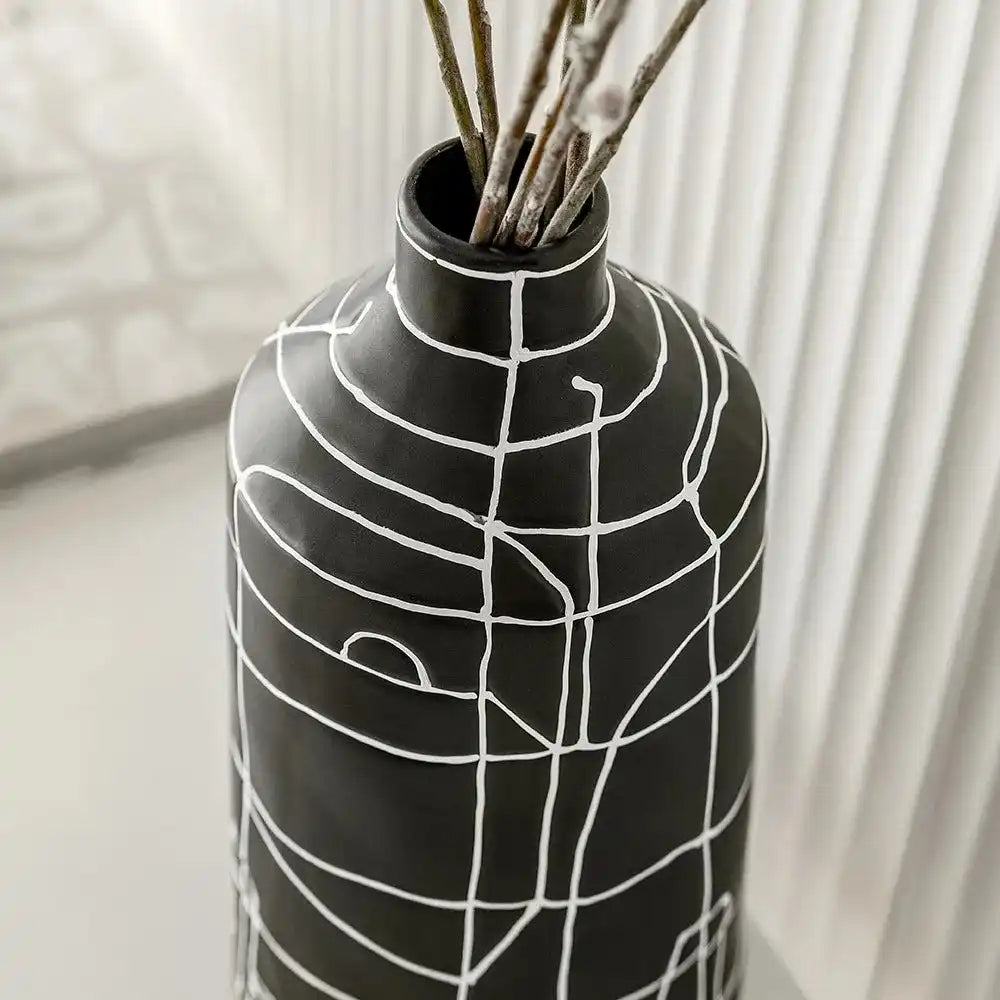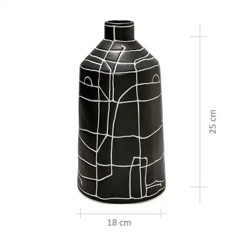 مزهرية بفم ضيق مزينة بنمط خطوط تجريدي بالكامل ستكون إضافة رائعة لديكورك الداخلية. تأتي من السيراميك وبتصميم مميز وأنيق.