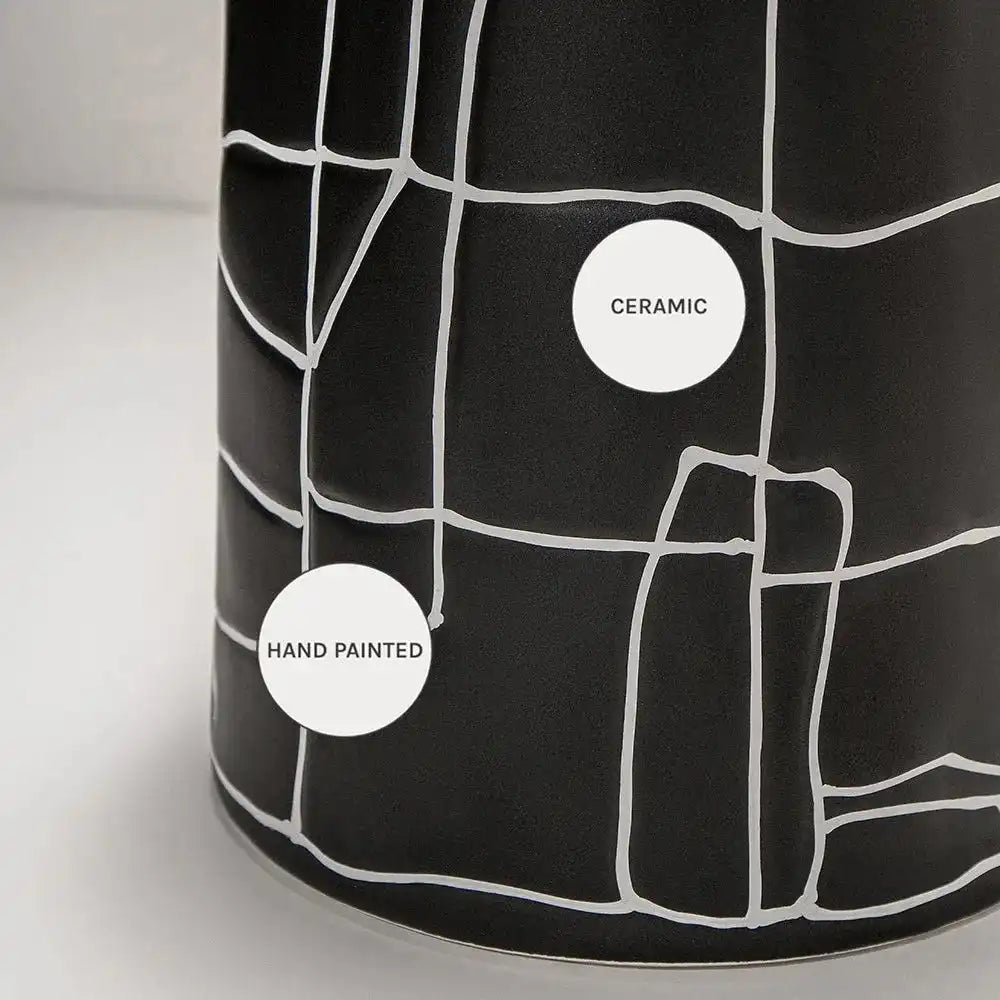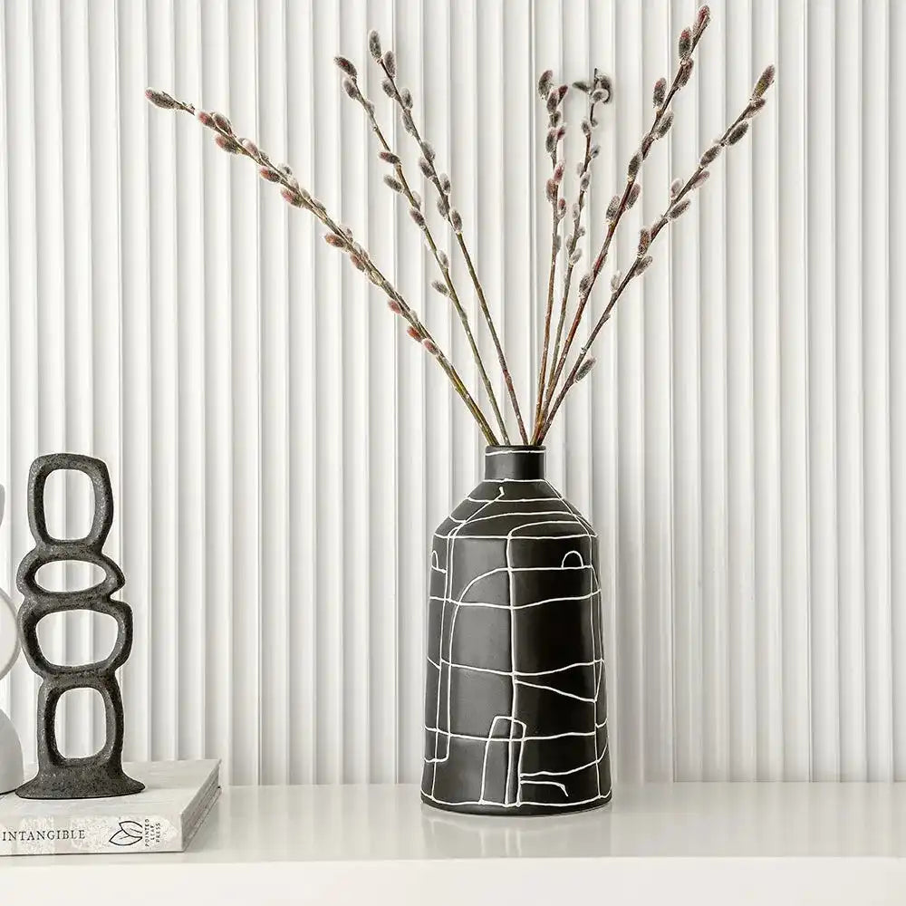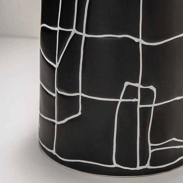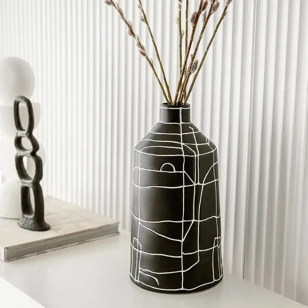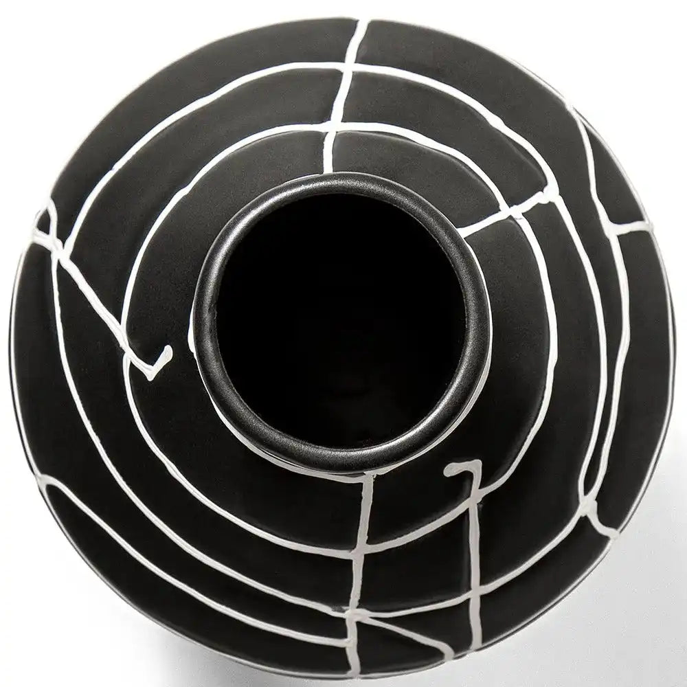 مزهرية بفم ضيق مزينة بنمط خطوط تجريدي بالكامل ستكون إضافة رائعة لديكورك الداخلية. تأتي من السيراميك وبتصميم مميز وأنيق.