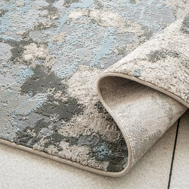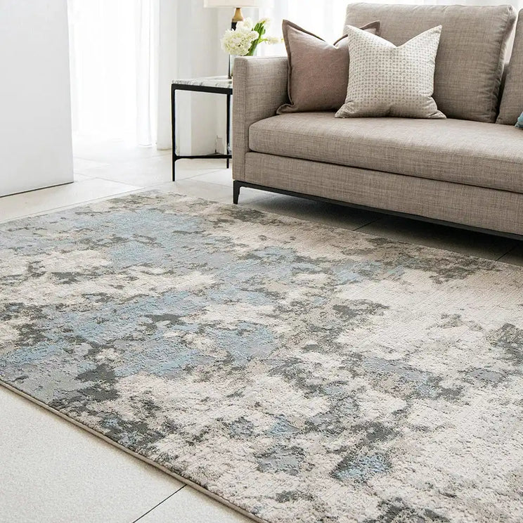 سجادة باللون الرمادي والأزرق وتصميم تجريدي ستجعلك تستمتع بالجلوس في منزلك.