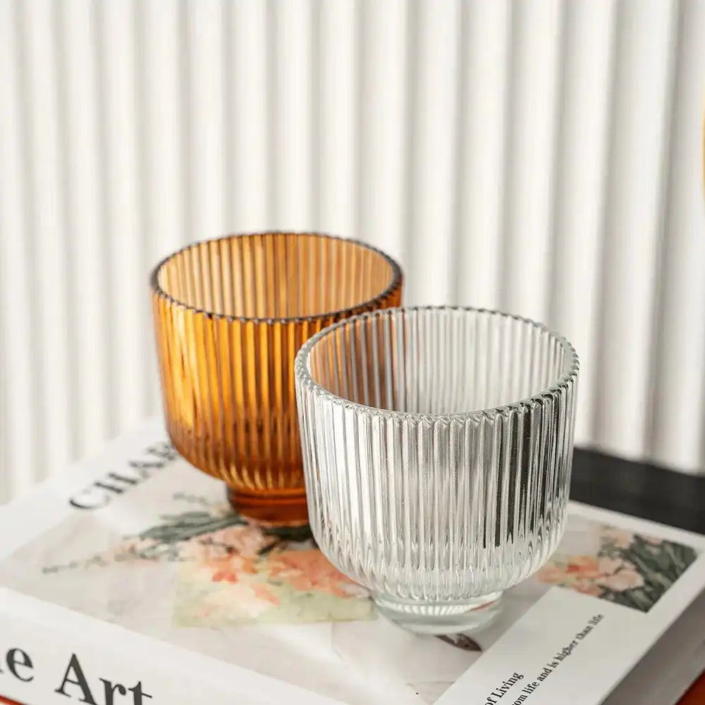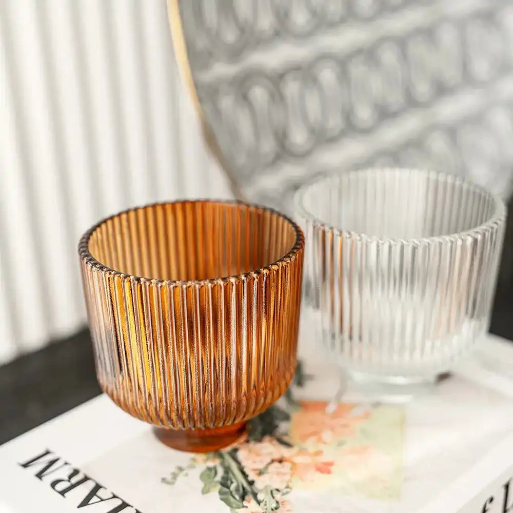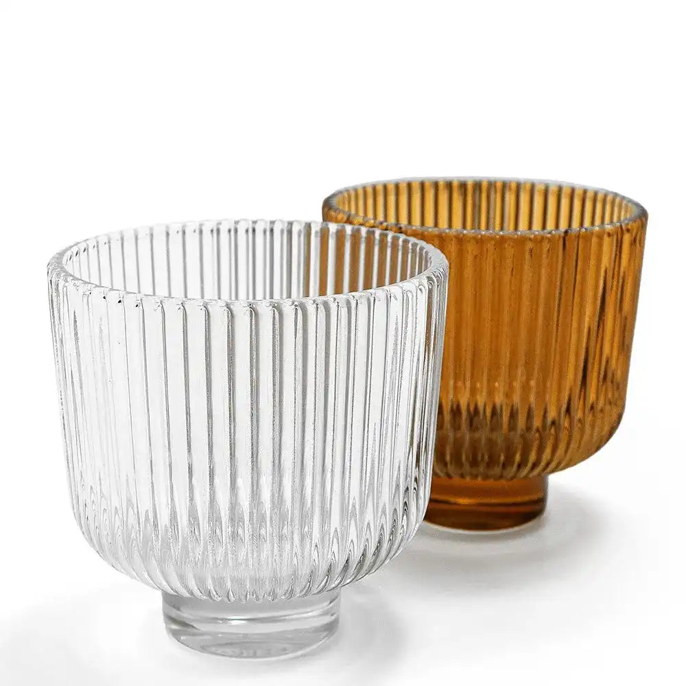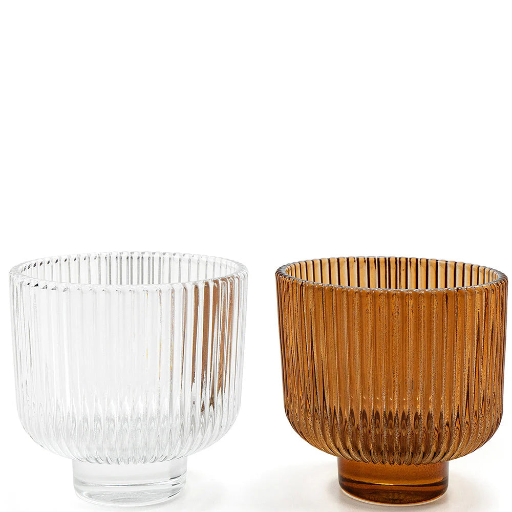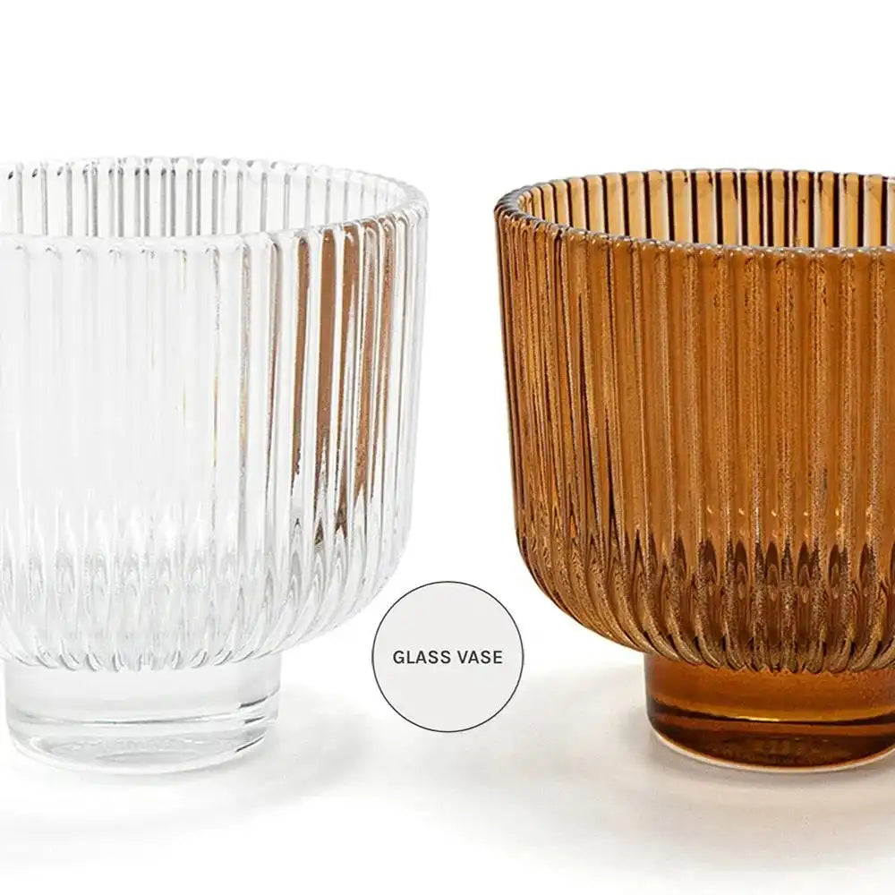 تشتمل هذه المجموعة على مزهرية واحدة شفافة وأخرى بلون برتقالي دافئ، وكلاهما يتميزان بتصميم مزخرف بحواف عمودية.