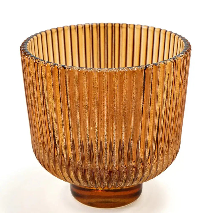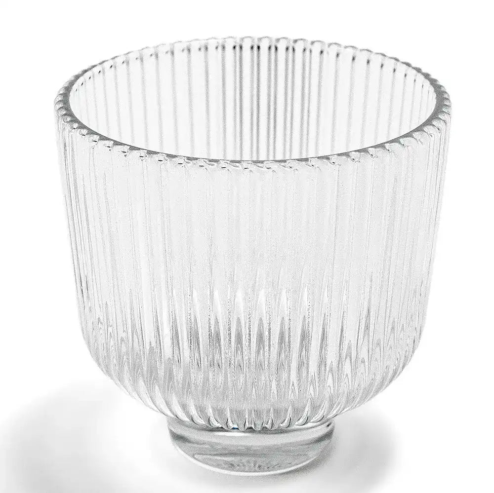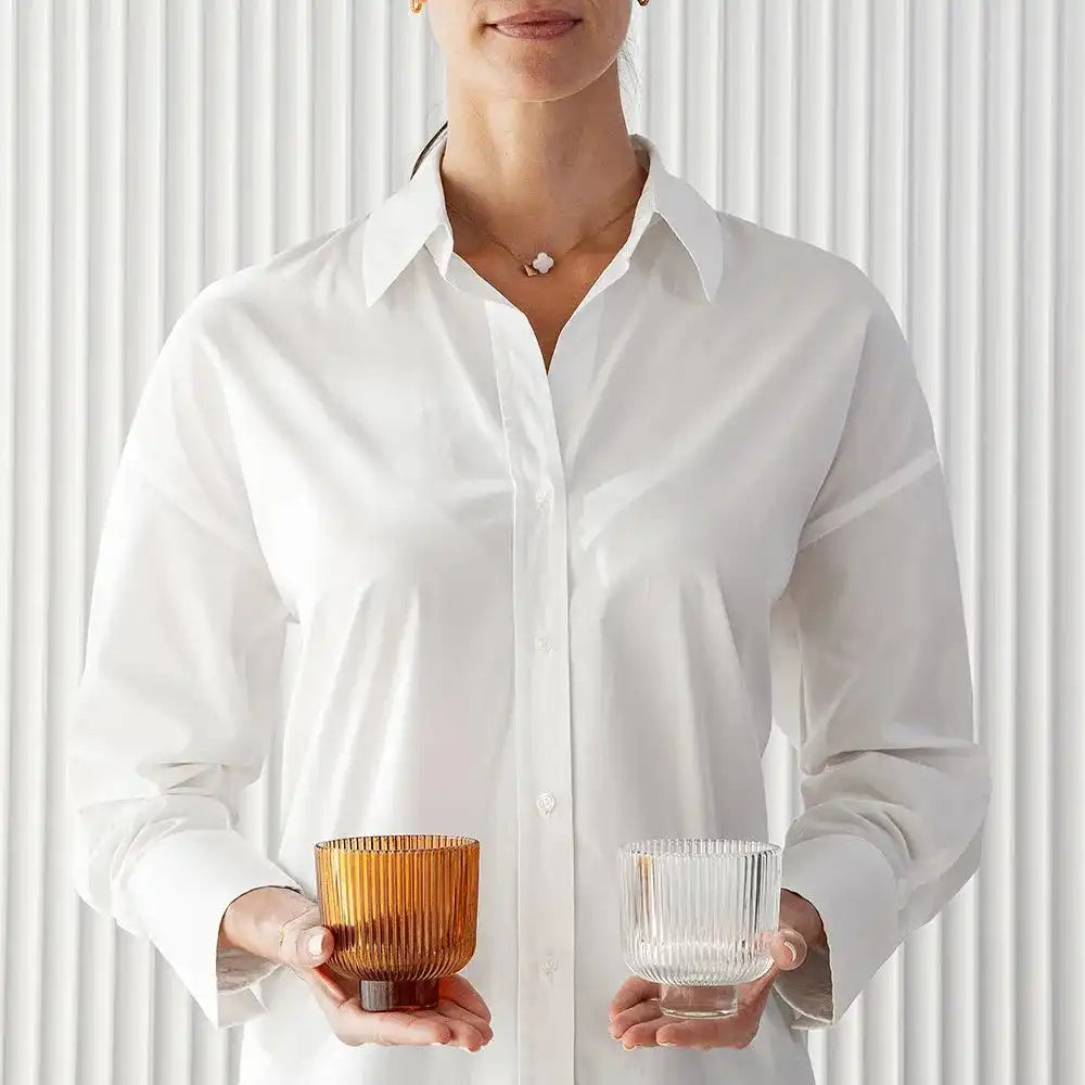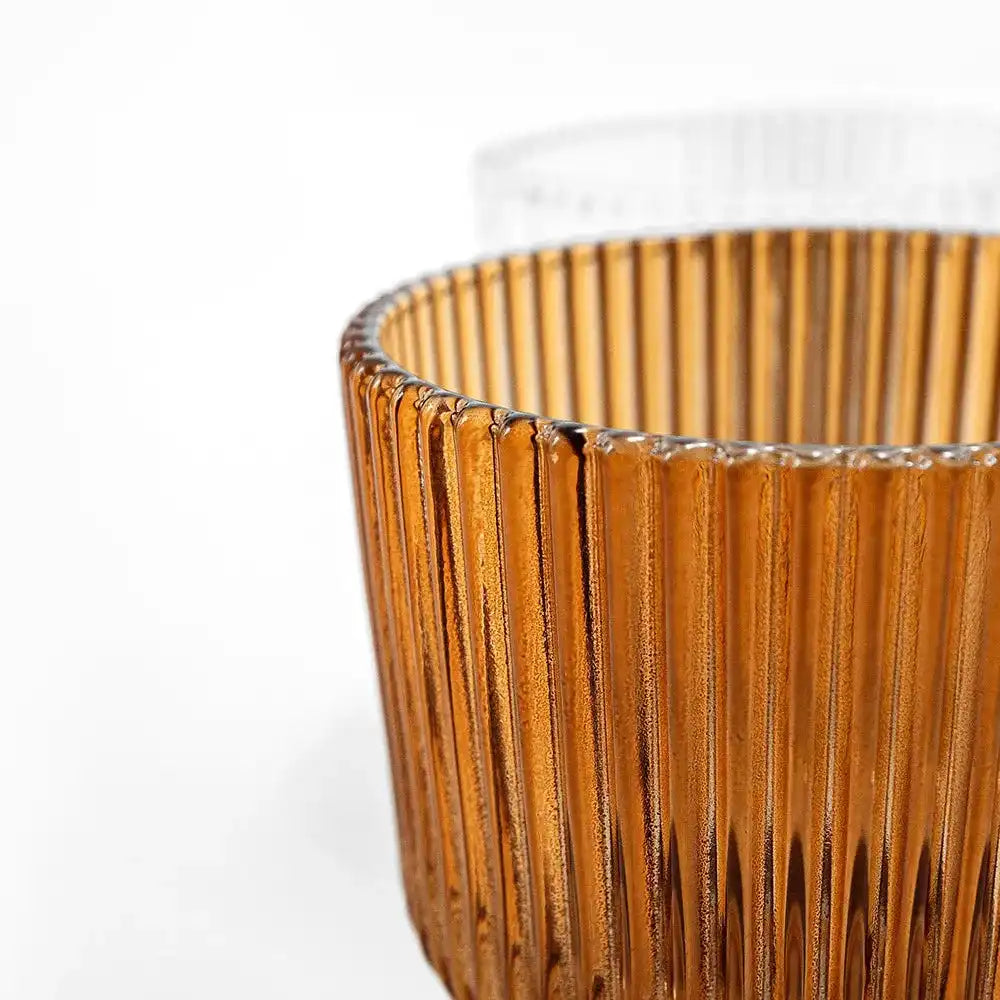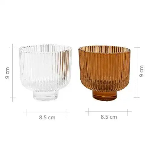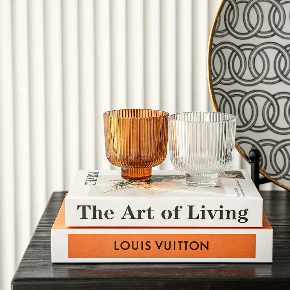 تشتمل هذه المجموعة على مزهرية واحدة شفافة وأخرى بلون برتقالي دافئ، وكلاهما يتميزان بتصميم مزخرف بحواف عمودية.