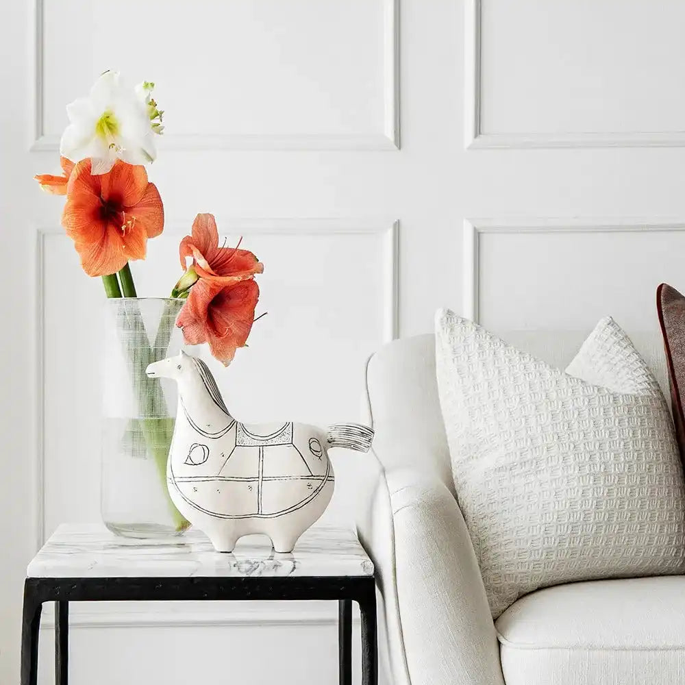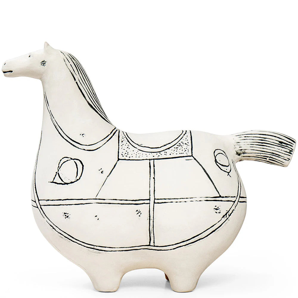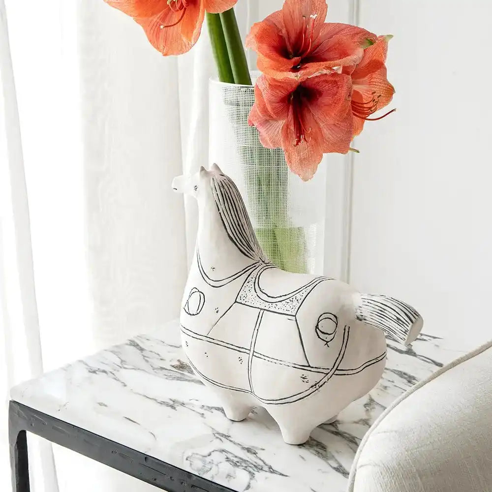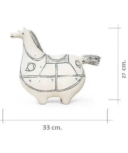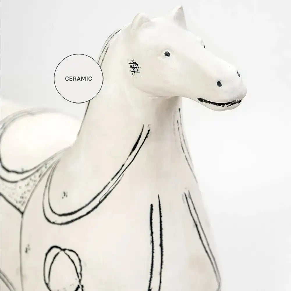 تصميم على شكل حصان من السيراميك الأبيض مع تفاصيل سوداء سيضيف لمسة مميزة إلى غرفة معيشتك.
