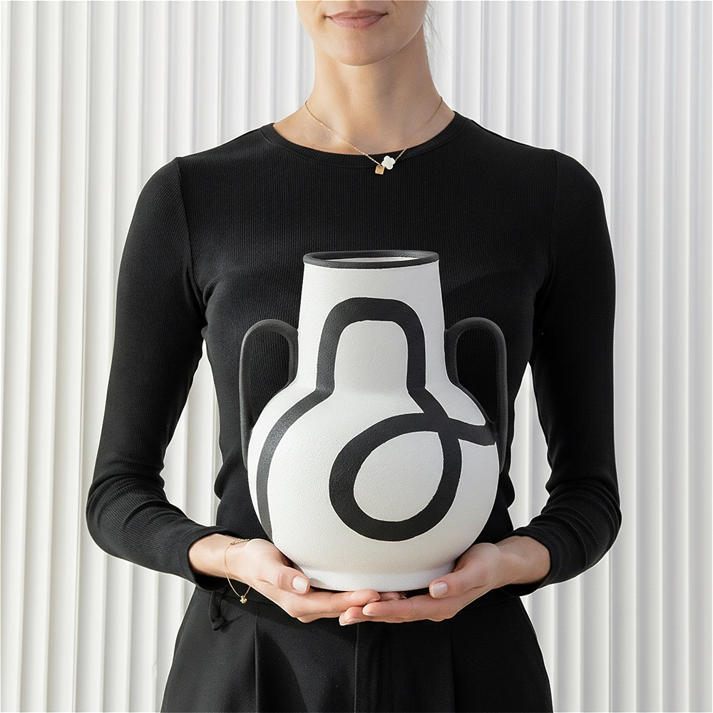 التصميم: زهرية أمفورة بنمط خطوط مع حافة ومقابض بتباين الألوان