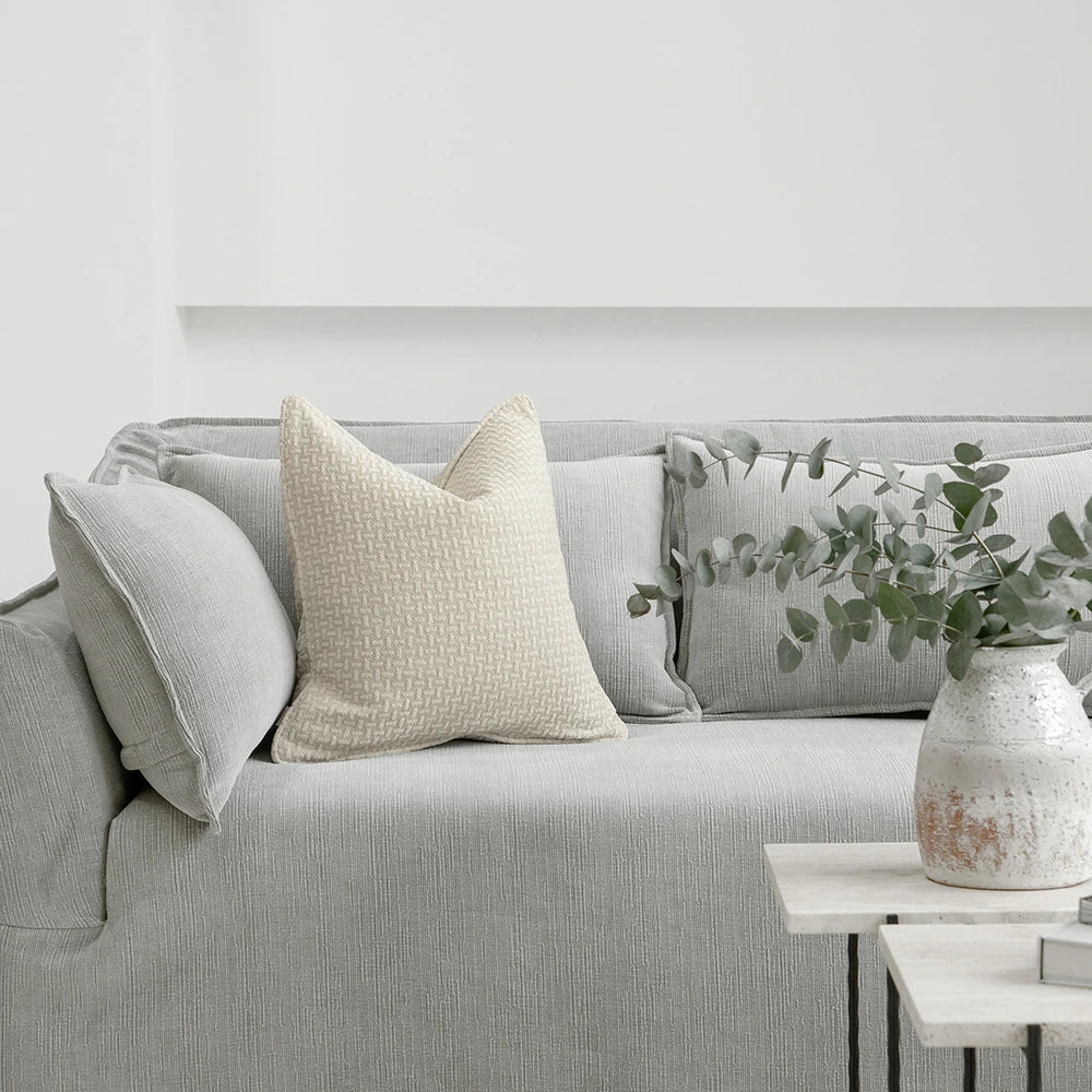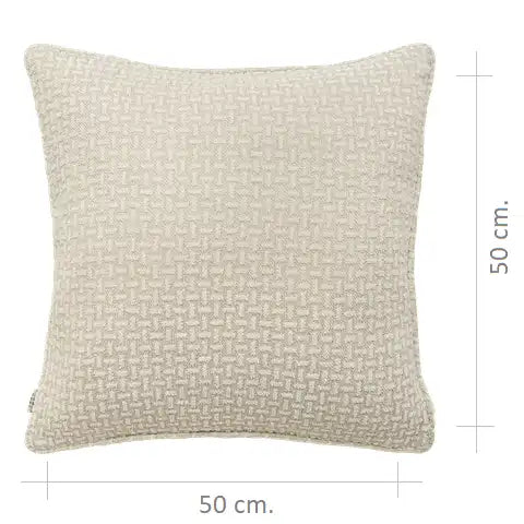 وسادة ناعمة ومنحوتة باللون الحجري الفاتح، منسوجة بنسيج مرتفع وخفيف يضيف عمق هادئ. مُصممة بحافة نظيفة وظهر بنفس اللون، لتوفر مظهر متناسق وأنيق