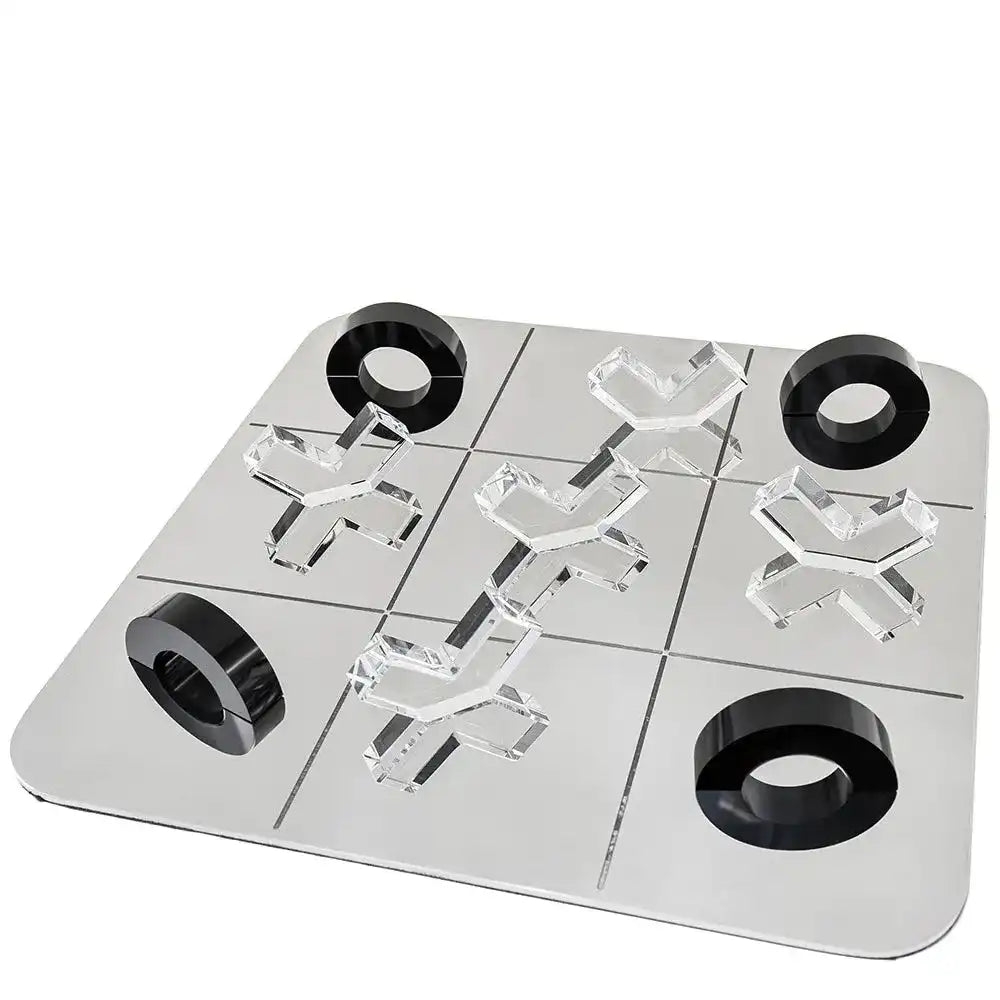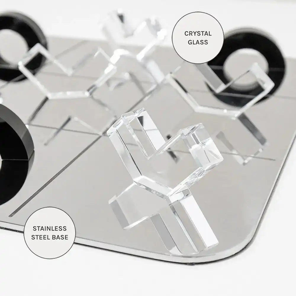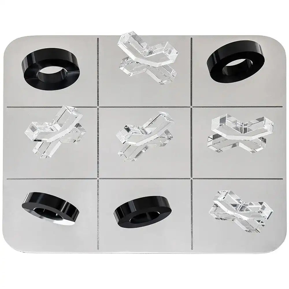 استمتع بلوحة لعب فولاذية مع مع أشكال O وشكل X شفافة بشكل مختلف. تأتي هذه اللوحة من الفولاذ المقاوم للصدأ، مع قطع مصنوعة من الزجاج البلوري. لتكون هدية رائعة.