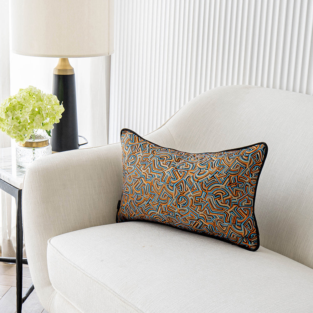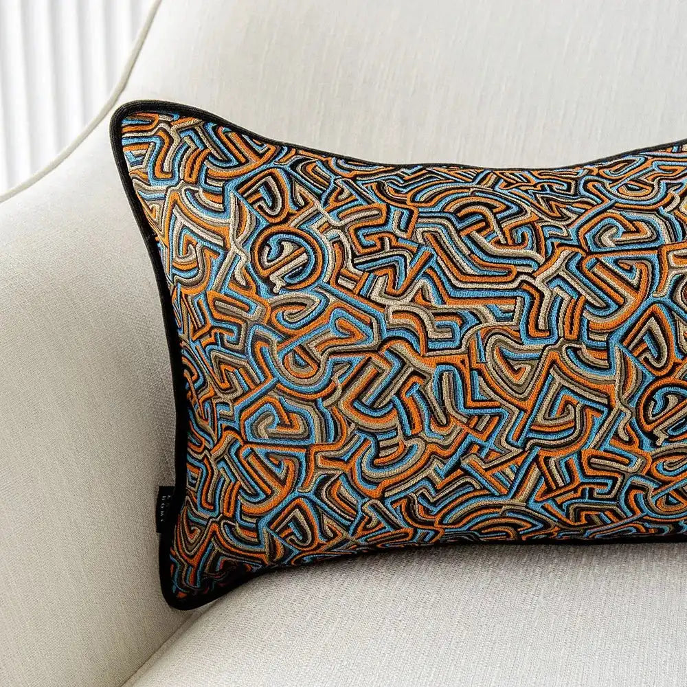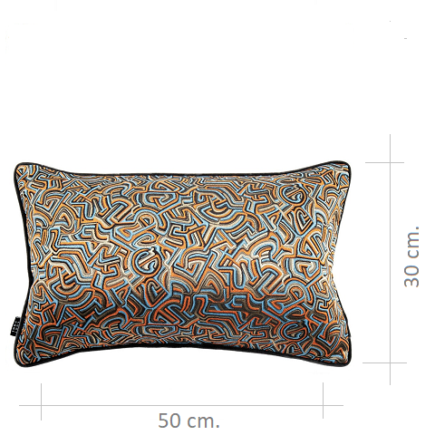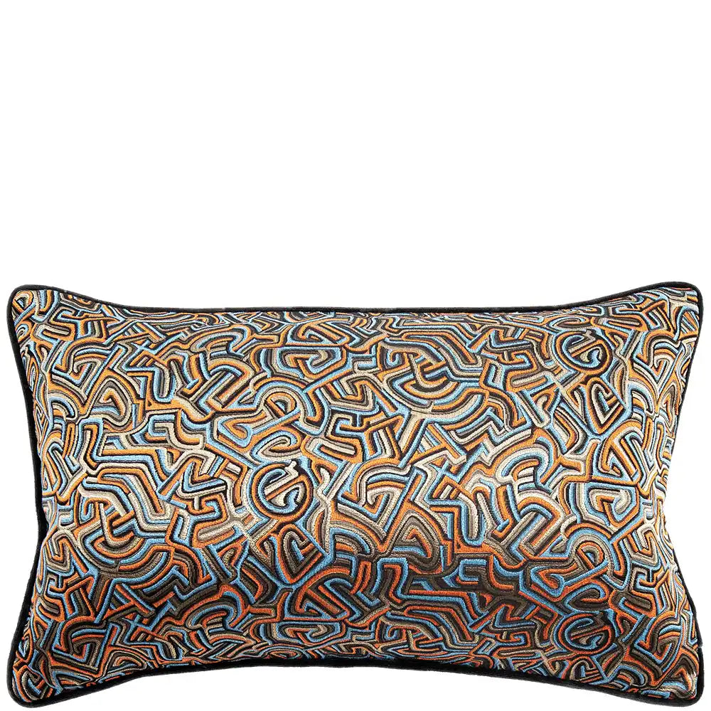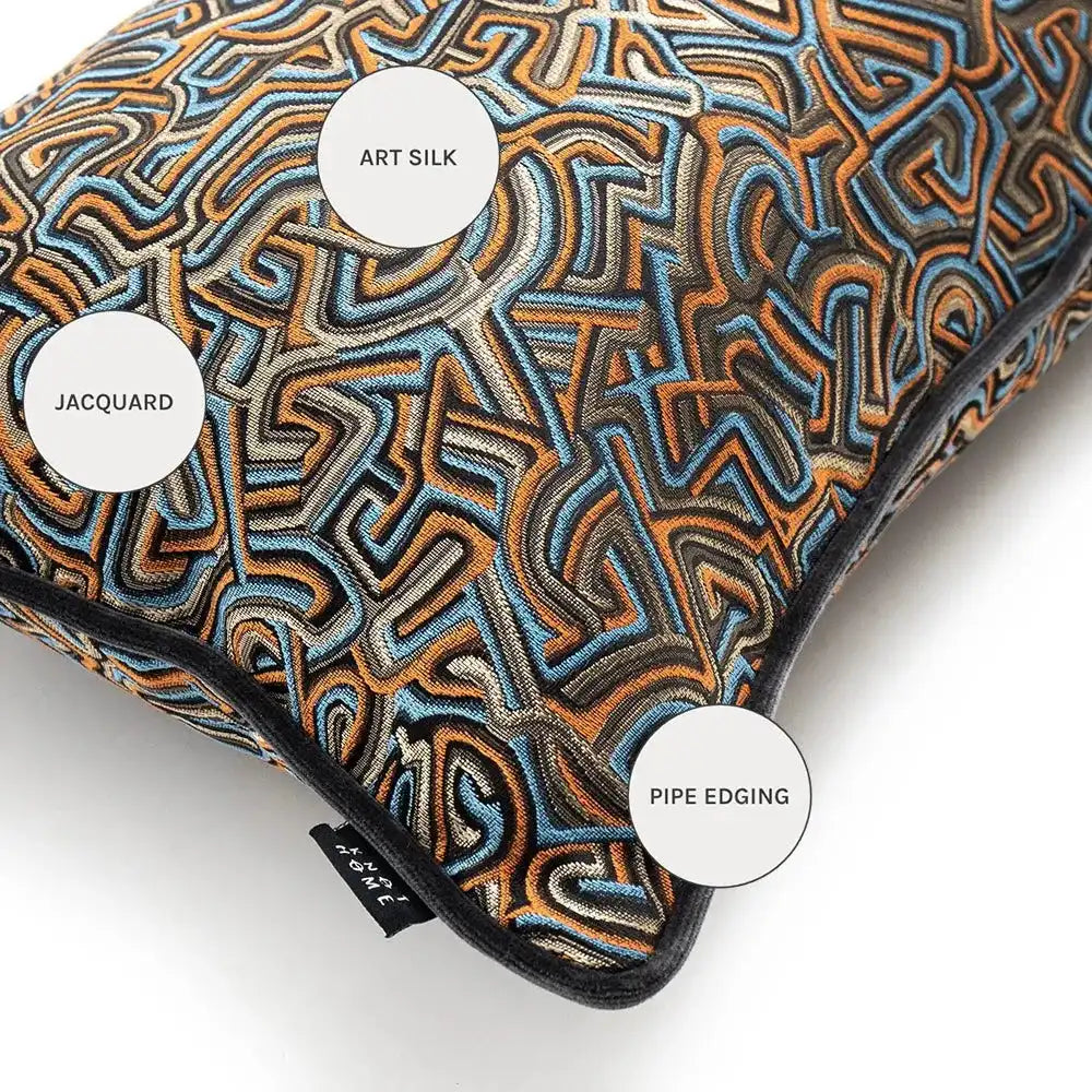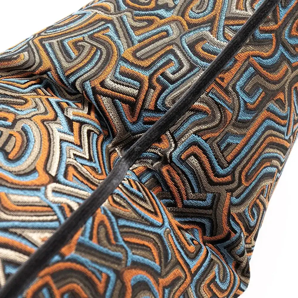 تتميز هذه الوسادة المميزة بنمط جريء ومميز باللون الأسود مع لمسات برتقالية وزرقاء وفضية، بالإضافة إلى حواف أنبوبية باللون الأسود.