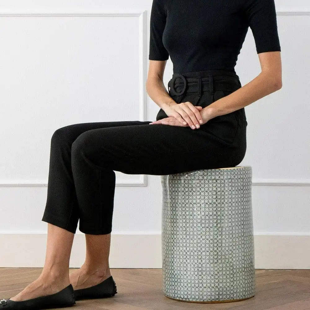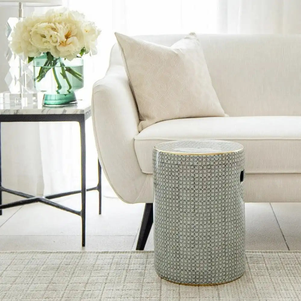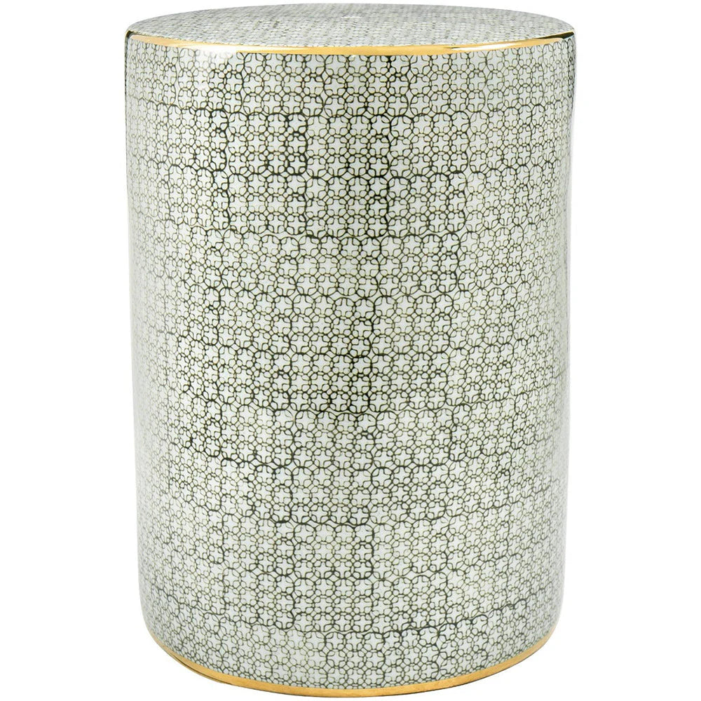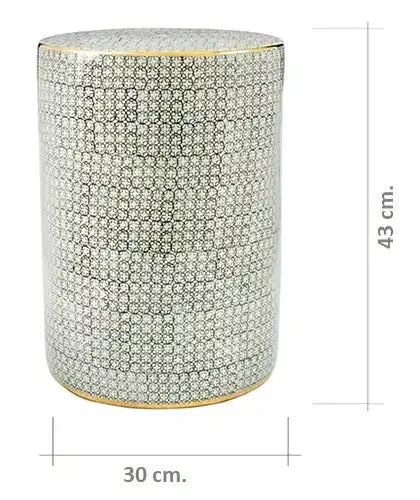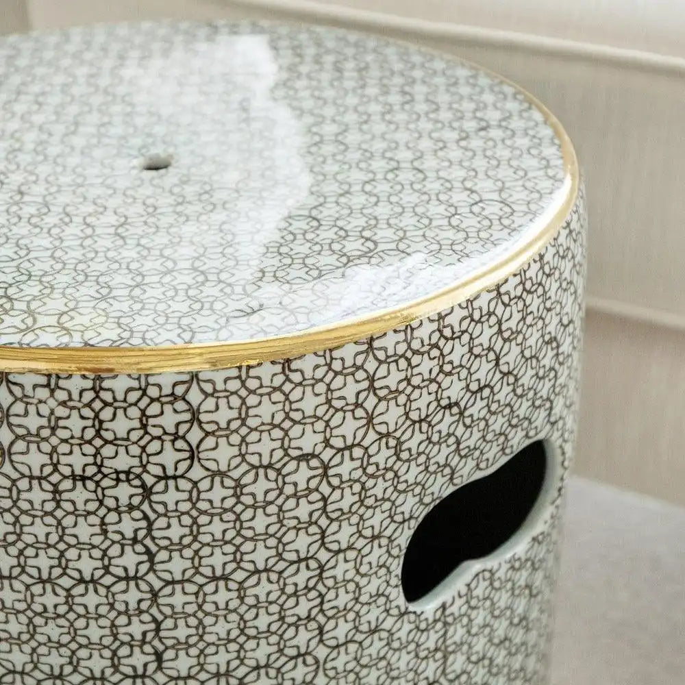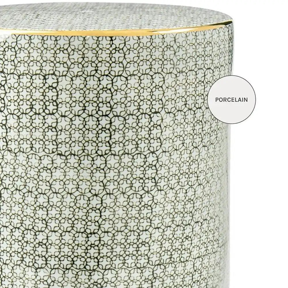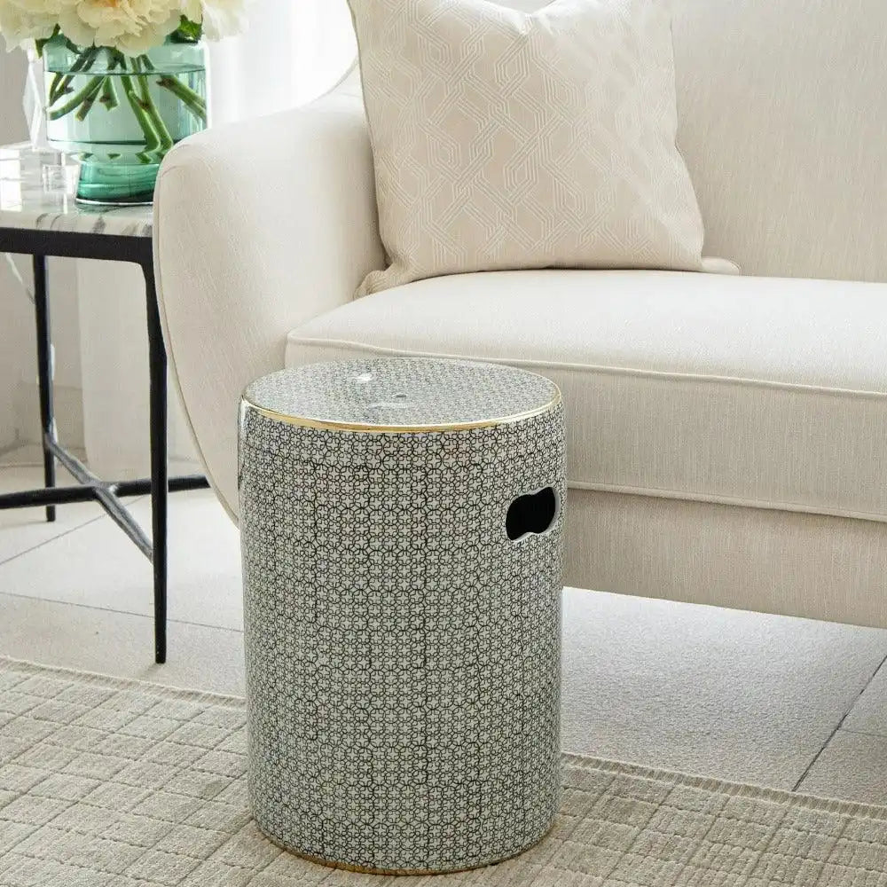 مقعد بورسلين منقوش باللونين الرمادي والأسود مع حافة ذهبية هو مقعد متعدد الاستخدامات يأتي بتصميم أنيق ويضيف لمسة ساحرة إلى إي غرفة.
