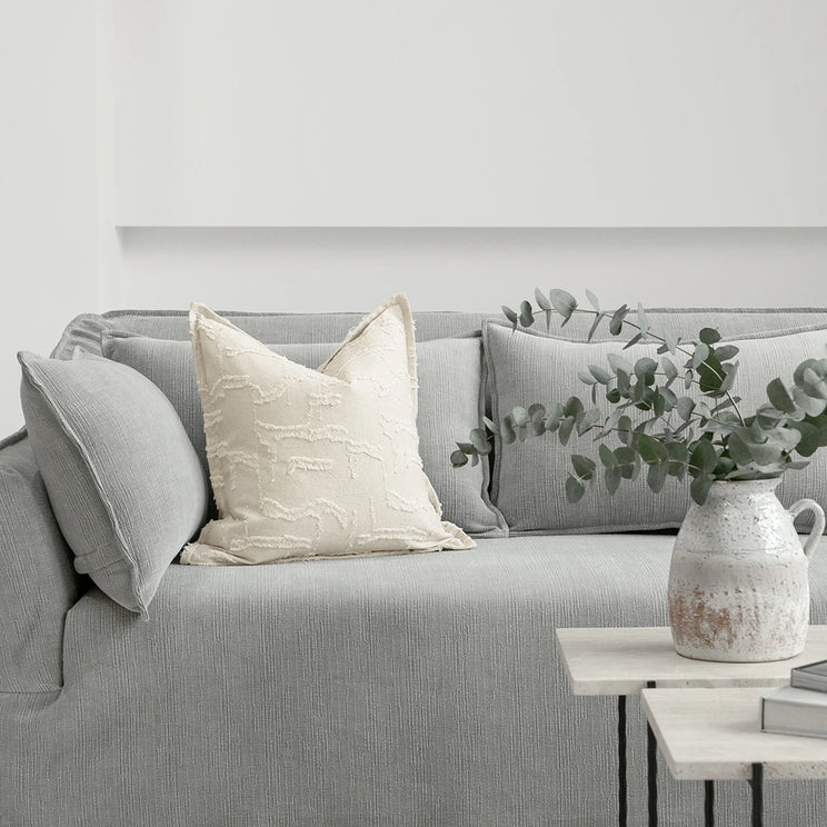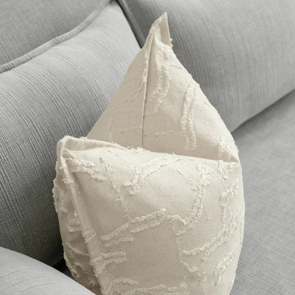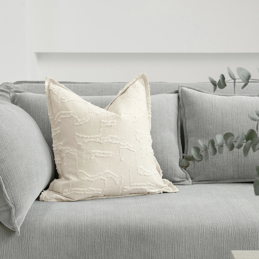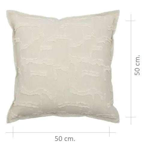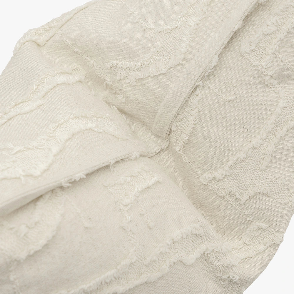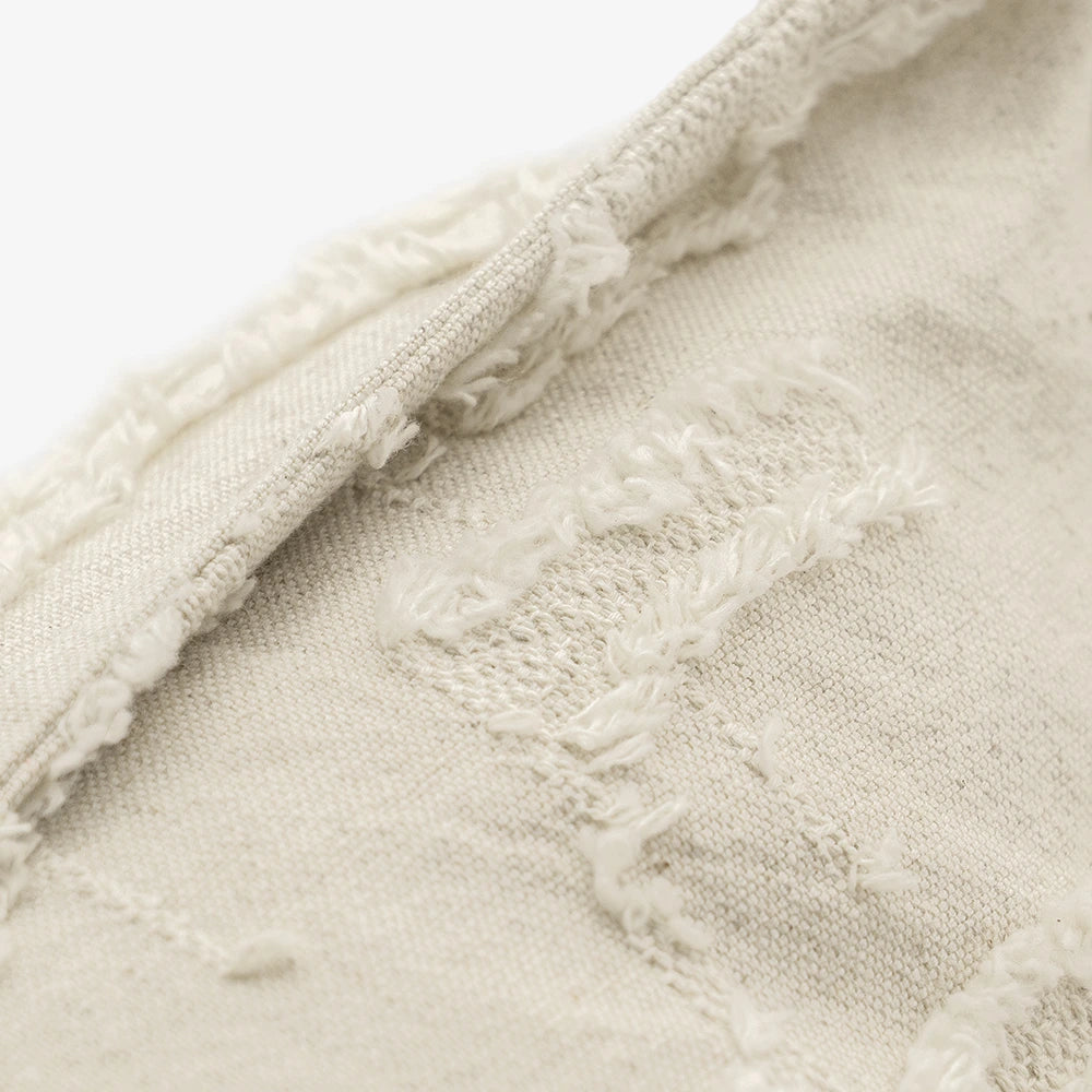 وسادة ناعمة بملمس مميز مصنوعة من مزيج طبيعي من القطن والكتان بلون كريمي دافئ. تضيف التفاصيل المرتفعة والشراريب لمسة من الحركة والعمق الخفيف، مع الحفاظ على مظهر هادئ وبسيط. خفيفة، جيدة التهوية، وأنيقة بكل بساطة.
