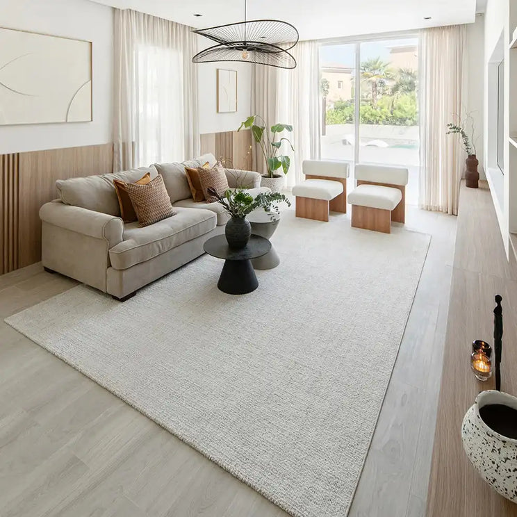 تتميز السجادة باللون اللؤلؤي العاجي بنمط نسيجي رقيق وناعم، كما تضفي ألوانها المحايدة لمسة أنيقة، مما يجعلها إضافة مثالية لأي غرفة