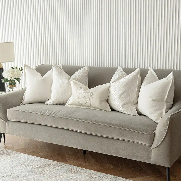 مجموعة لورنس فخمة وأنيقة وتحتوي على وسادتان من الجاكارد باللون الأبيض، ووسادتان بلون شبه لامع ووسادة من الجلد صناعي مع شكل حصان.