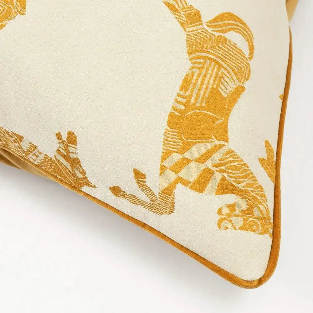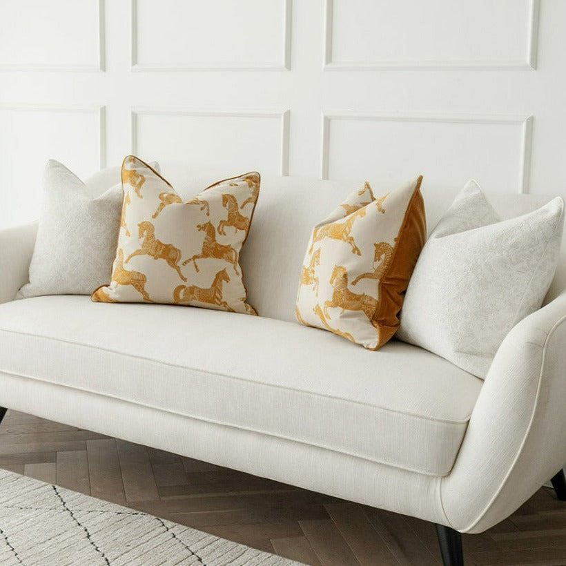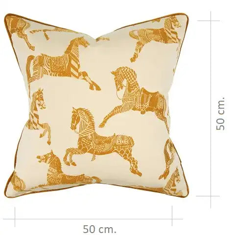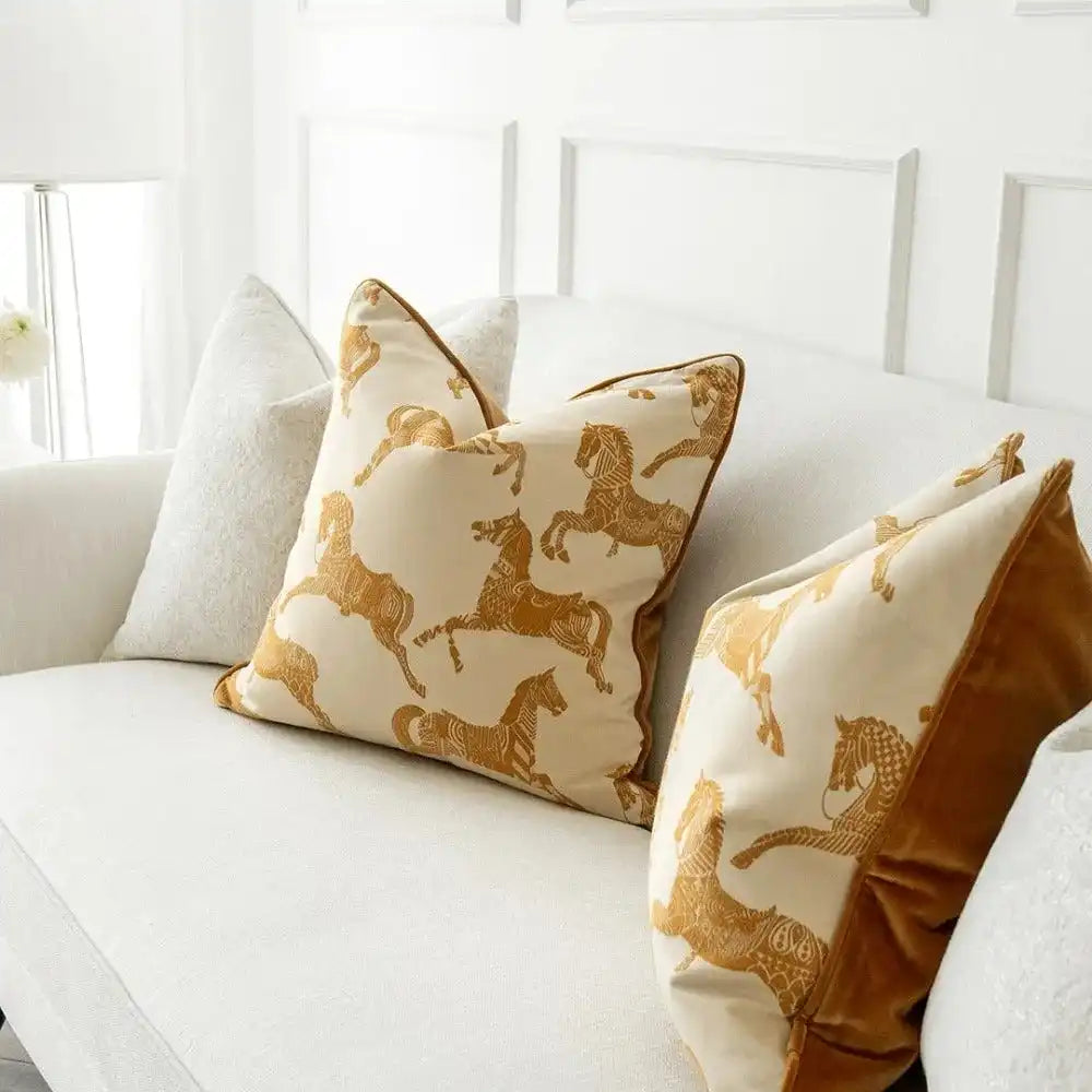 التصميم: وسادتان باللون الأبيض بتصميم متقاطع، ووسادتان باللونين الأصفر والبيج مزينة بتصميم على شكل حصان