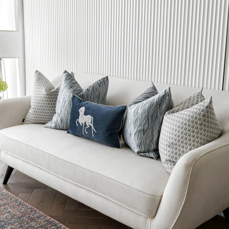 التصميم: وسادتان بتصميم ثلاثي الأبعاد، ووسادتان منقوشتان بالألماس الفضي والأزرق ووسادة زرقاء مع تطريز حصان