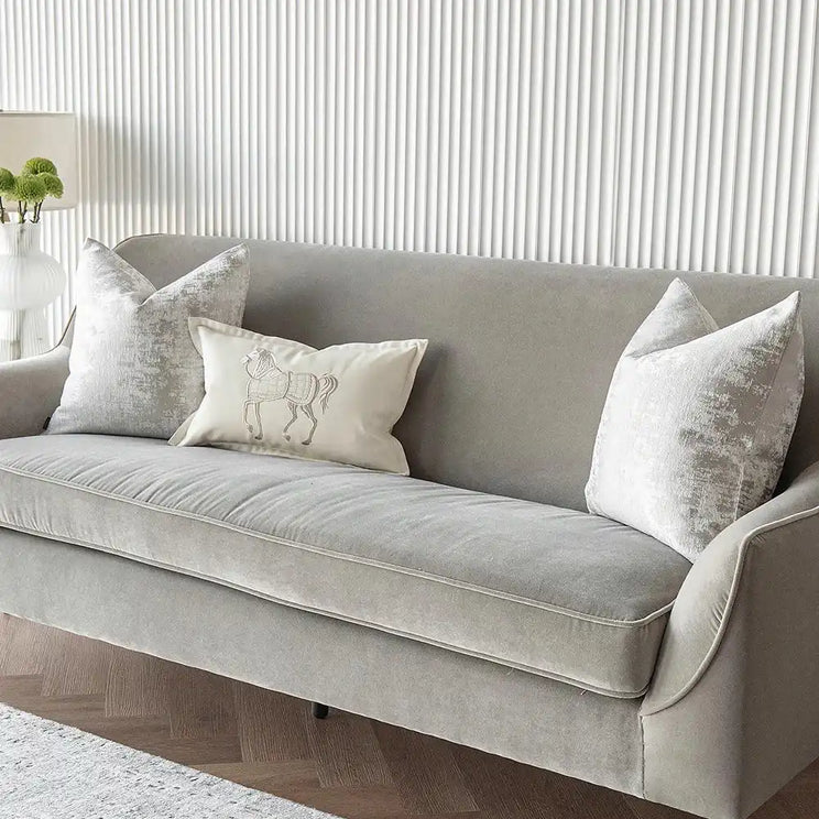 التصميم: وسادتان من نسيج الجاكارد الفضي والرمادي ووسادة من الجلد صناعي مع تطريز حصان