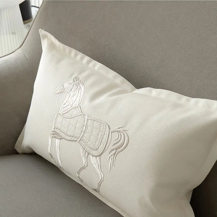 التصميم: وسادتان باللون الأبيض اللامع، ووسادتان رماديتان بنمط ثلاثي الأبعاد ووسادة من الجلد صناعي مع شكل حصان