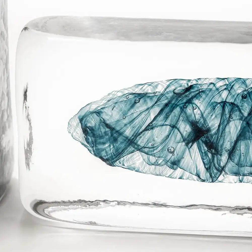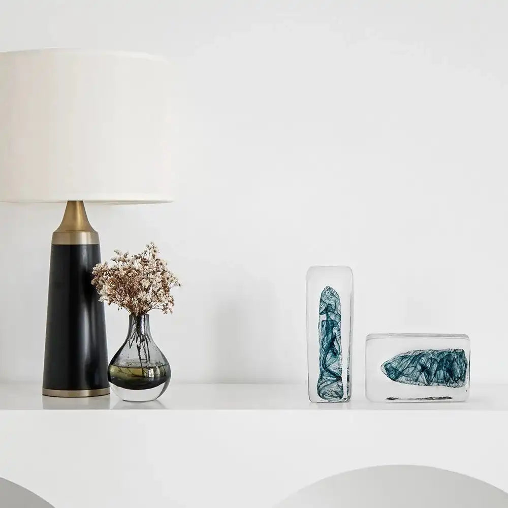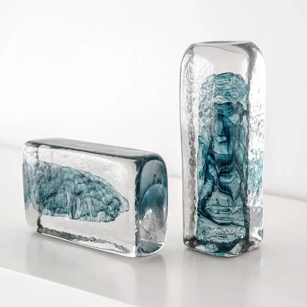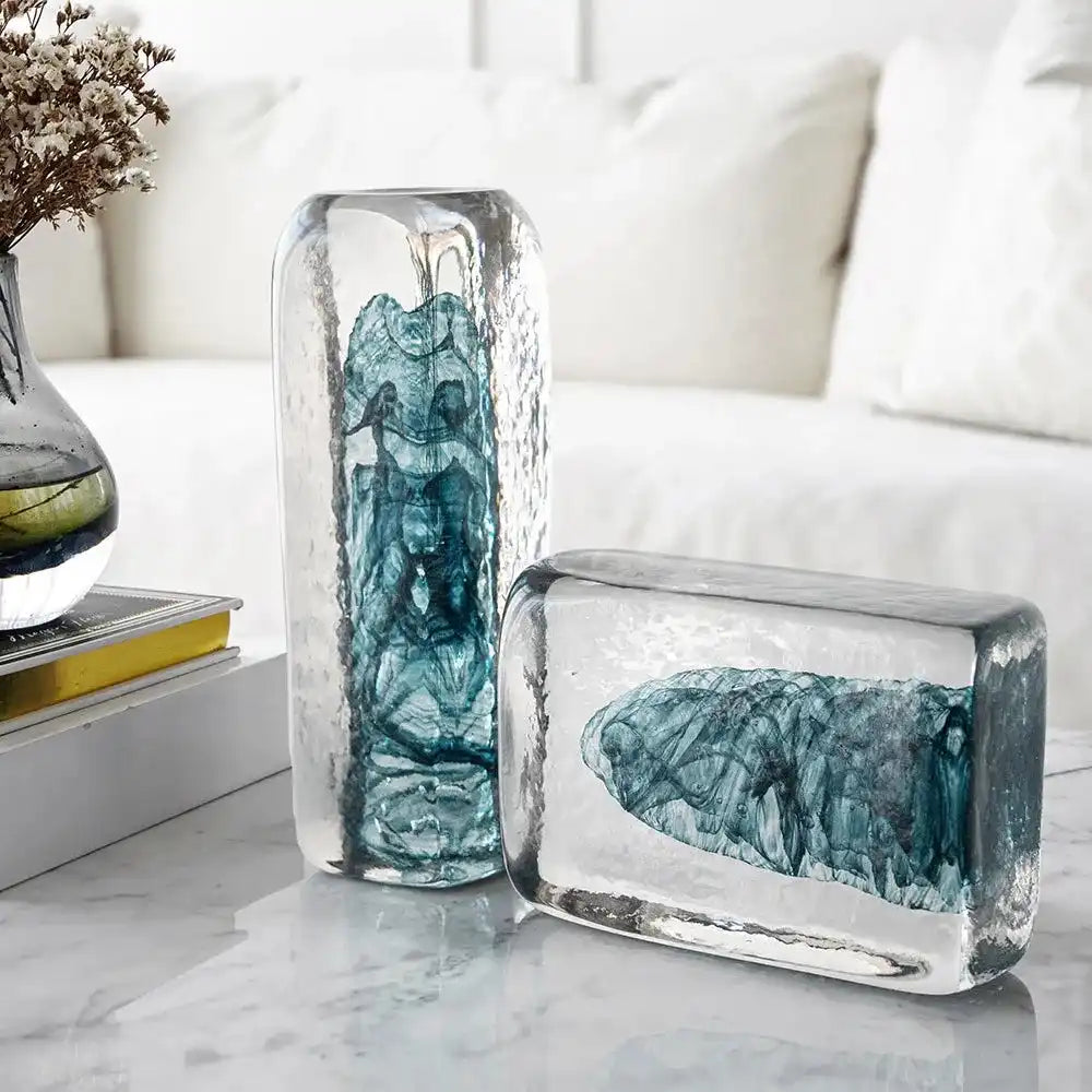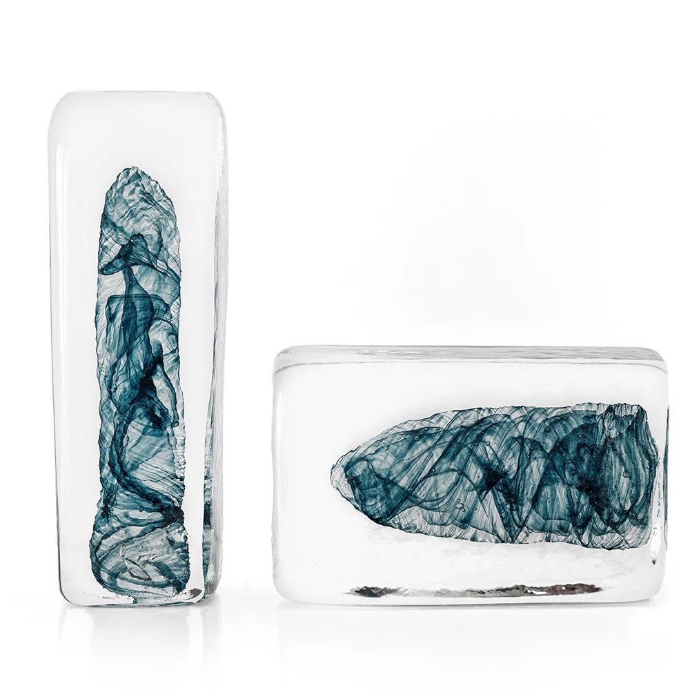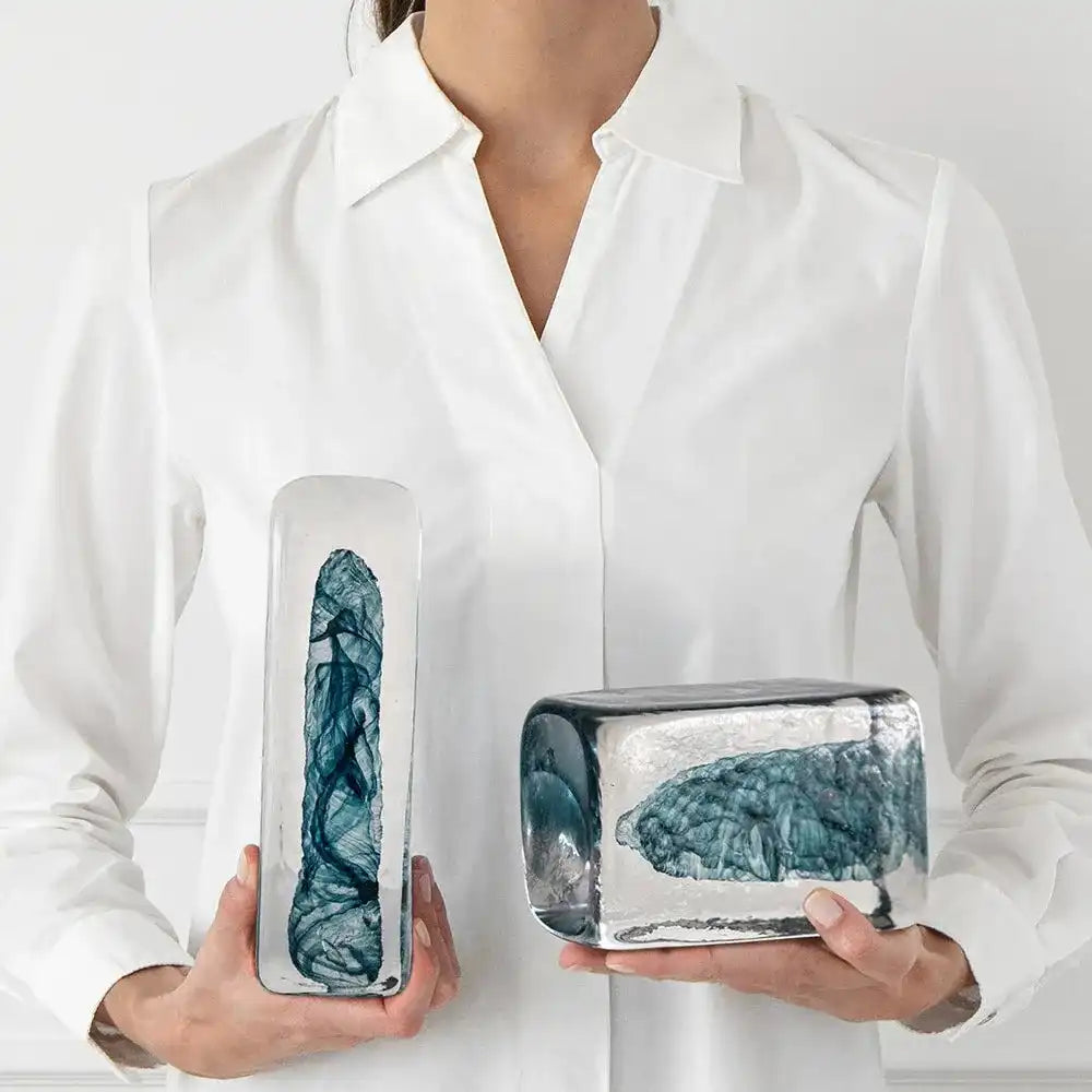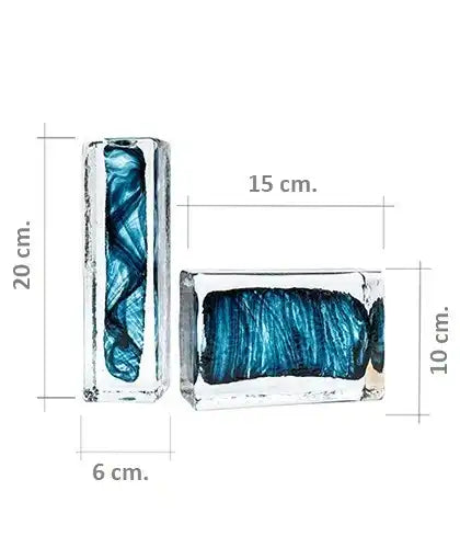 منحوتتان من الطوب الزجاجي بجزء داخلي أزرق تأتي بأحجام مختلفة وهي اكسسوار مميز في غرفة معيشتك أو المكتب.