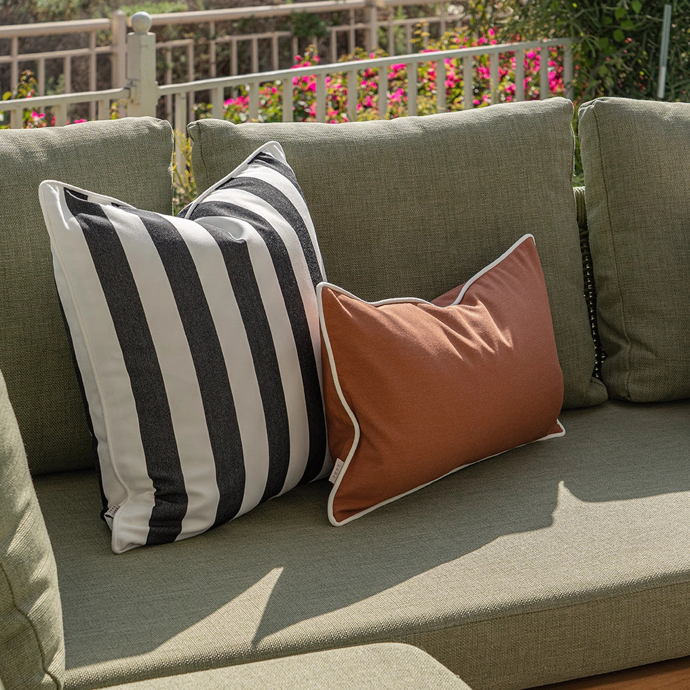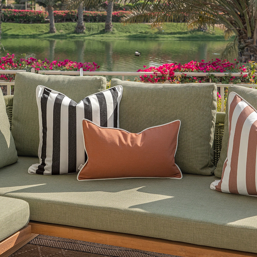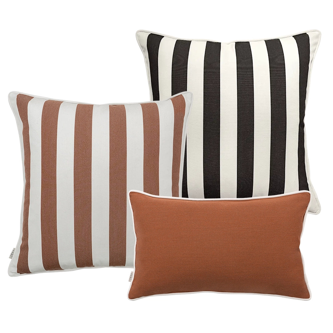 أضف لمسة من الأناقة إلى مساحتك الخارجية مع هذه المجموعة الثلاثية من الوسائد. تشمل الوسائد السادة والمخططة بألوان عاجية، وأسود وأحمر داكن، لتناسب الأسلوب العصري البسيط بكل سهولة.