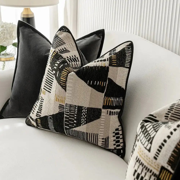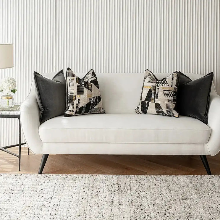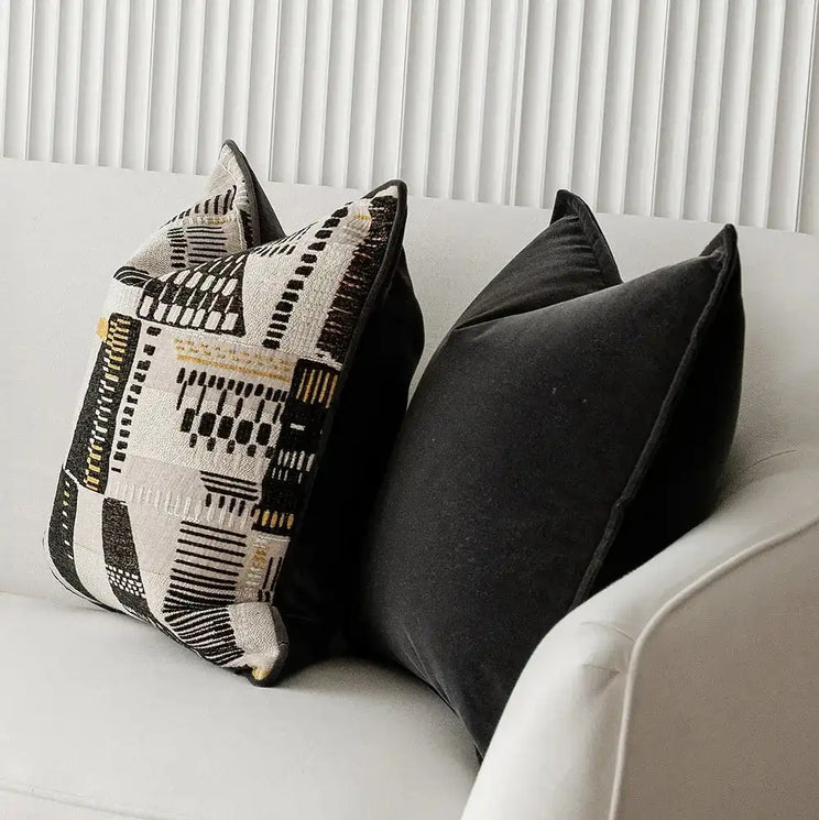 مجموعة كريشنا تأتي بألوان جريئة كالأسود والأبيض والذهبي. تحتوي على وسادتان من المخمل ووسادتان بنمط تجريدي لتخطف أنظار كل من في المكان