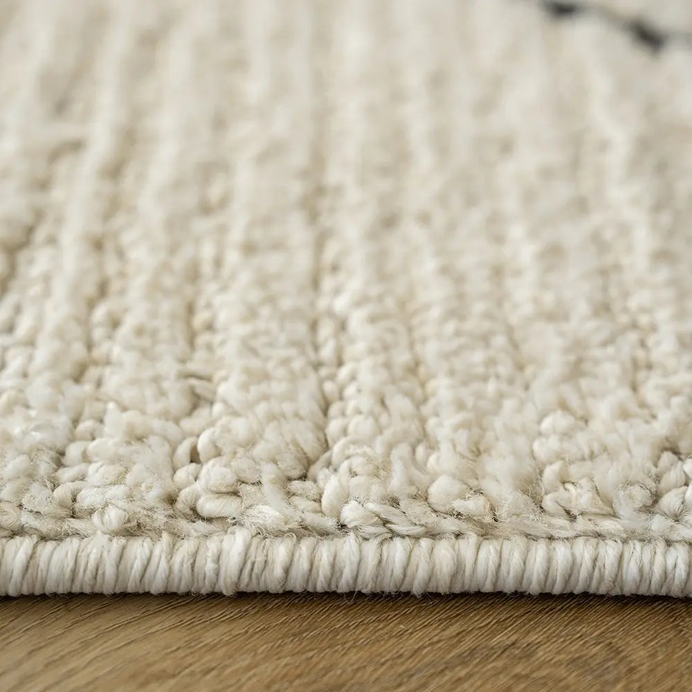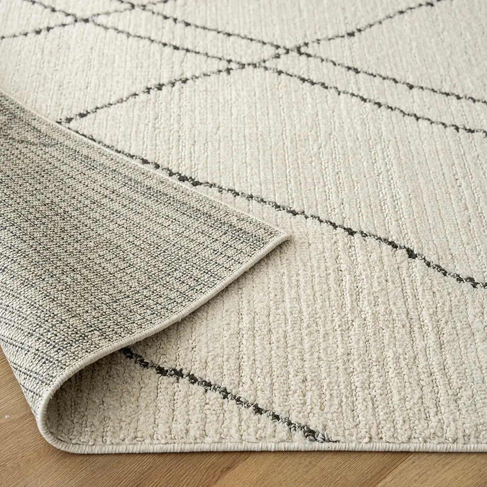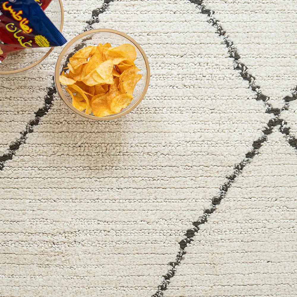 تخلق الخطوط غير المنتظمة نمطًا ماسيًا على هذه السجادة باللونين العاجي والبيج - وهو خيار أنيق لأي غرفة في منزلك.