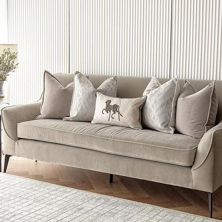 التصميم: وسادتين من المخمل الفاخر بلون بيج داكن ووسادتين بنمط مع ظهر من الجلد صناعي ووسادة بتصميم حصان