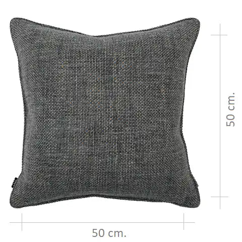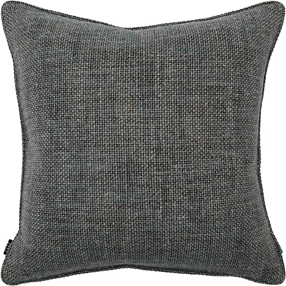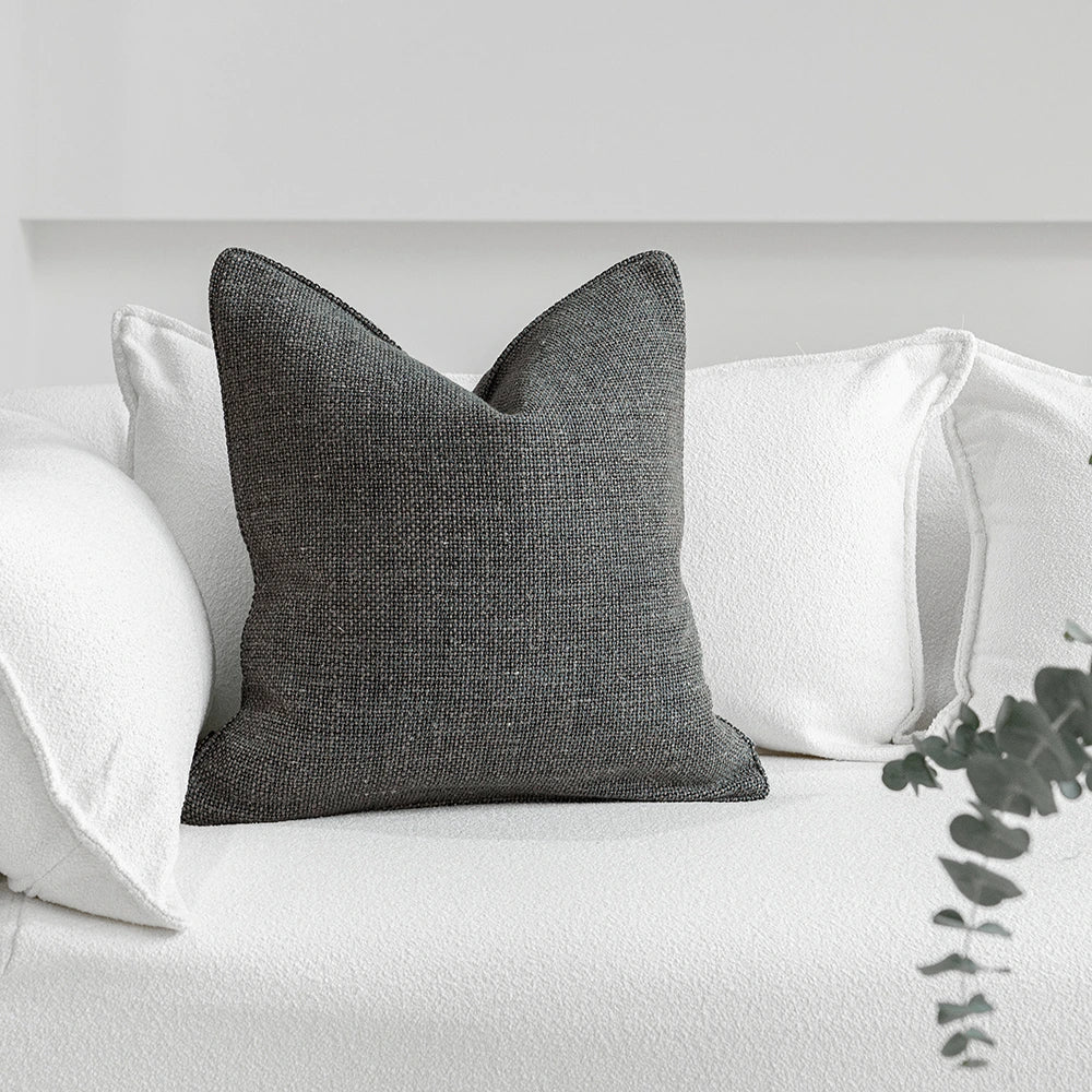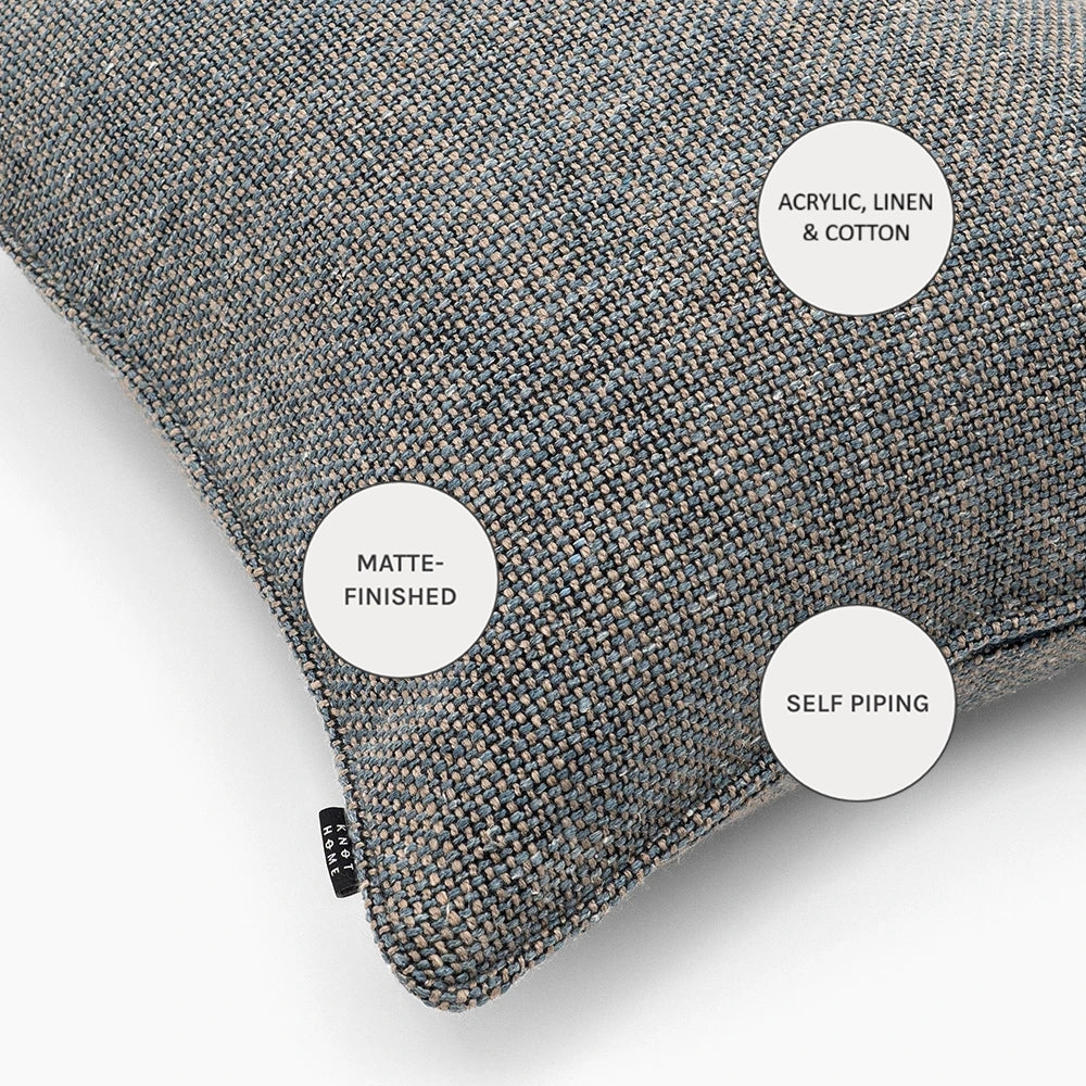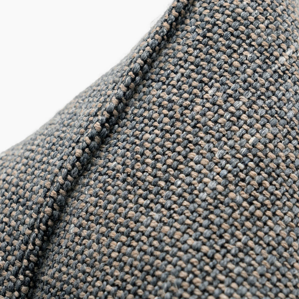 التصميم: نسيج محكم على شكل سلة مصنوع من خيوط باللون الفحمي والأزرق والرمادي المتداخلة، مع ألياف دافئة دقيقة تضفي عمقًا هادئًا للسطح. تحافظ الخلفية اللونية المتناسقة على وحدة الألوان، لتصبح الوسادة قطعة أنيقة أساسية للتنسيق متعدد الطبقات.