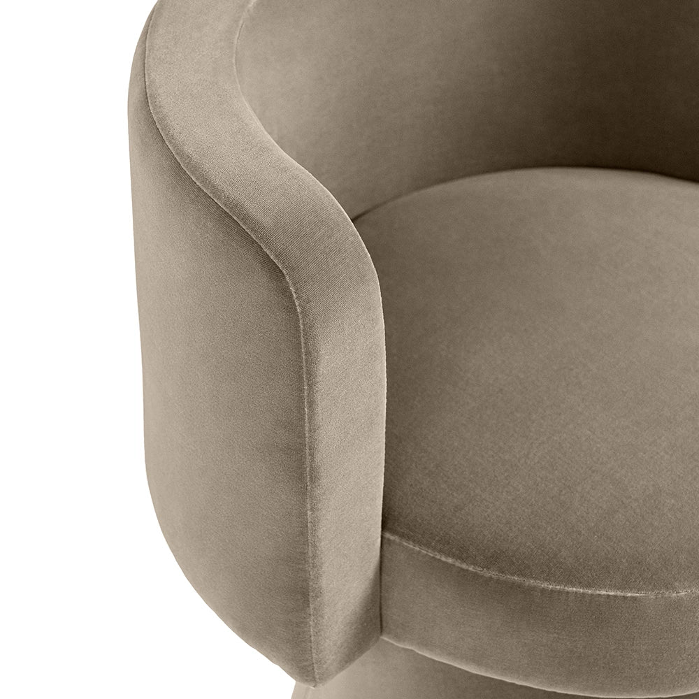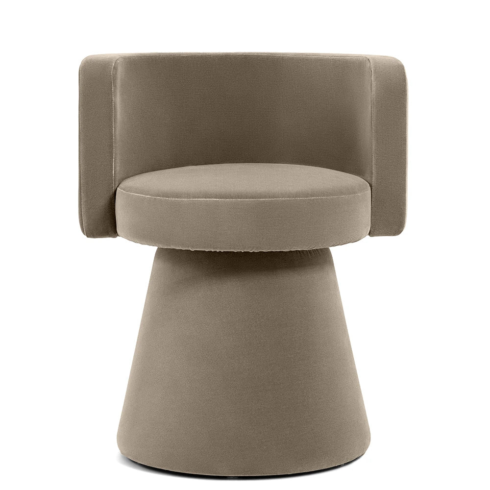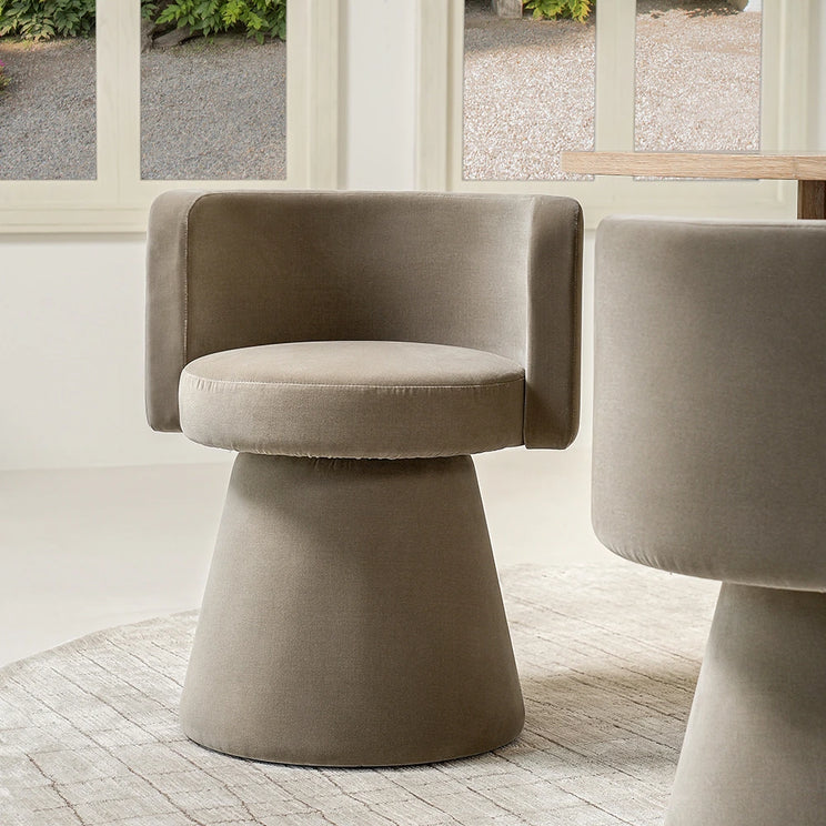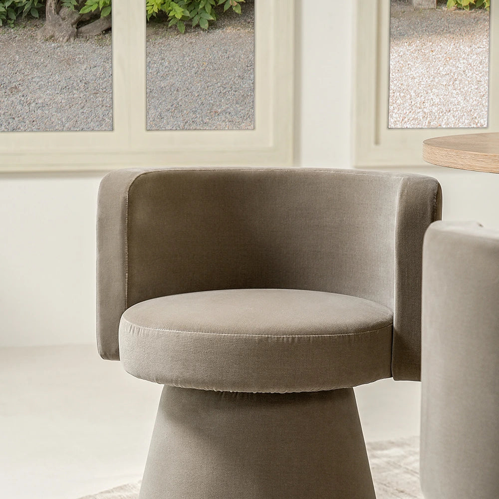 امنح غرفة معيشتك ترقية فورية مع هذا الكرسي الفردي باللون البني. كرسي دوّار بتصميم بسيط يجمع بين شكل نحتي، وقماش مخملي فاخر، وانحناءات ناعمة لراحة وأناقة بلا تنازلات.