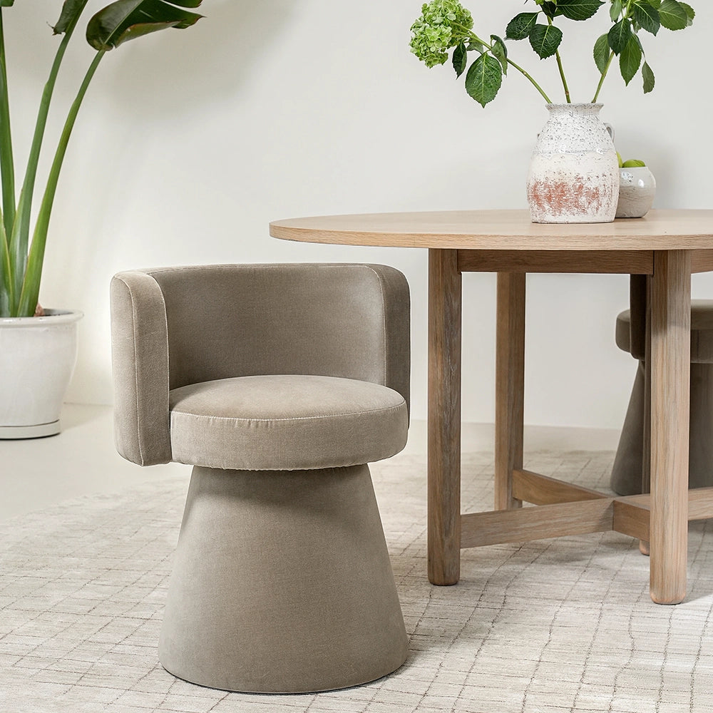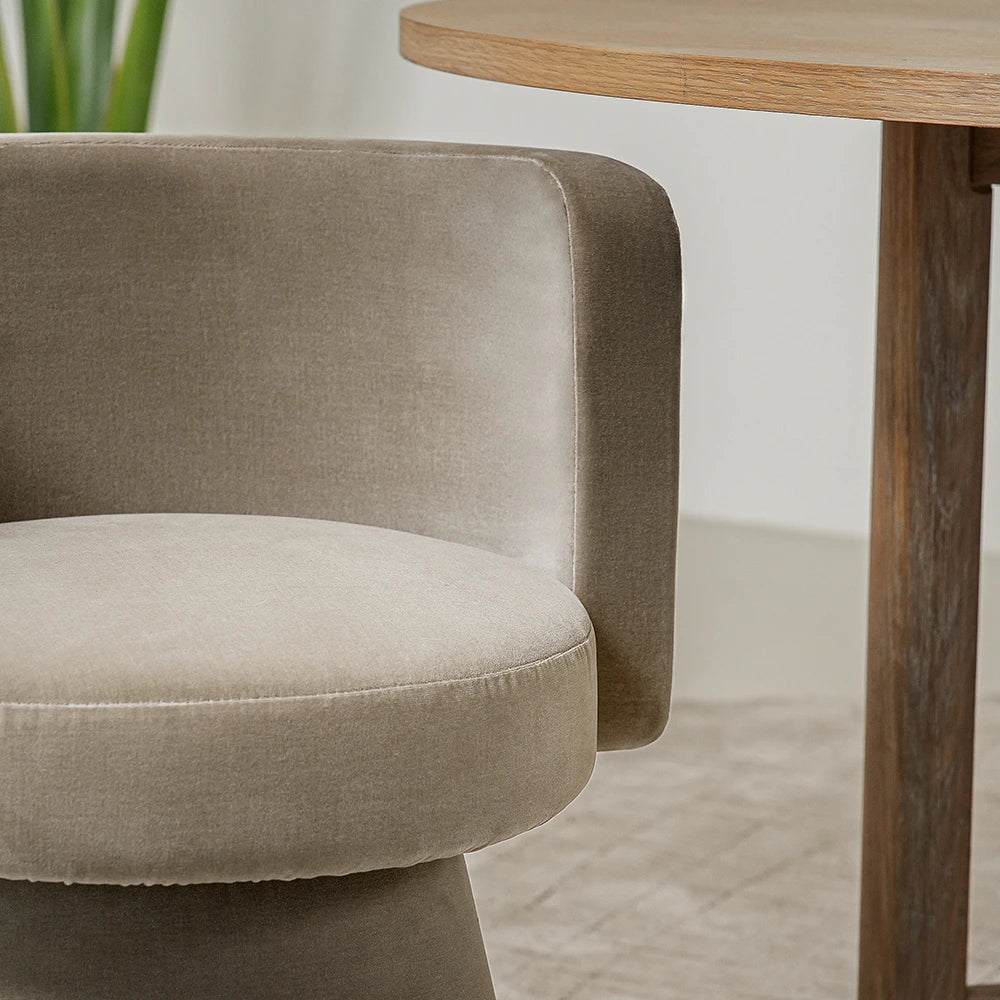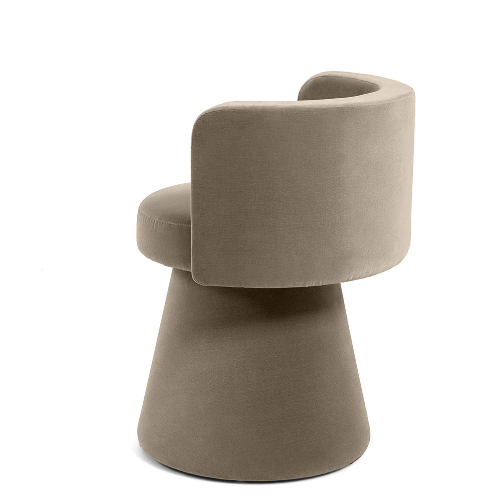 امنح غرفة معيشتك ترقية فورية مع هذا الكرسي الفردي باللون البني. كرسي دوّار بتصميم بسيط يجمع بين شكل نحتي، وقماش مخملي فاخر، وانحناءات ناعمة لراحة وأناقة بلا تنازلات.
