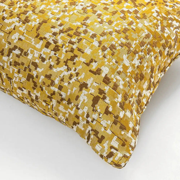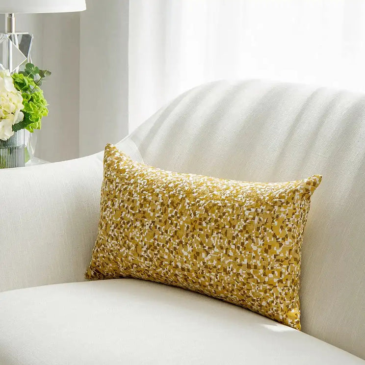 جدد غرفة معيشتك مع هذه الوسادة المميزة التي تأتي بتفاصيل عصرية لامعة من الحرير مع لمسات بيضاء وأساس باللون الذهبي الأصفر.