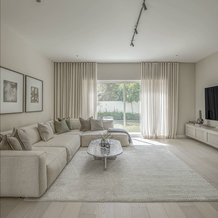 باللون البيج الرملي، هذه السجادة متعددة الاستخدامات تكمل أي مخطط ألوان