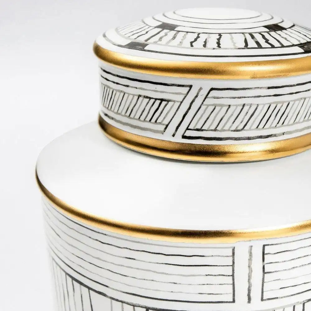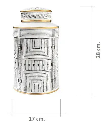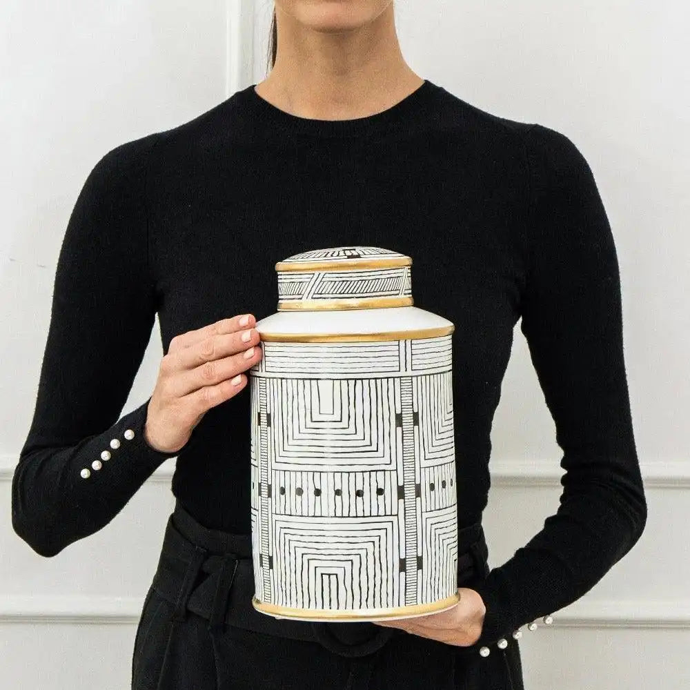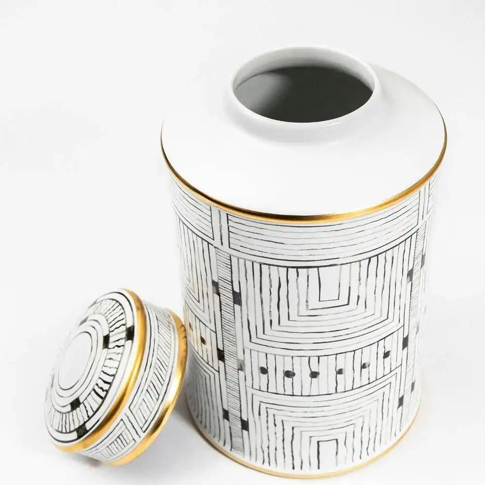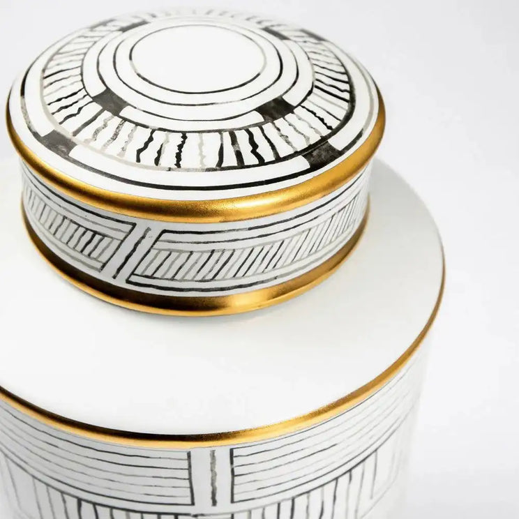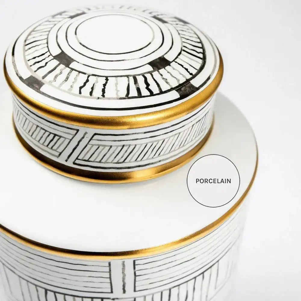 التصميم: علبة بورسلين باللونين الأسود والأبيض مع حافة ذهبية