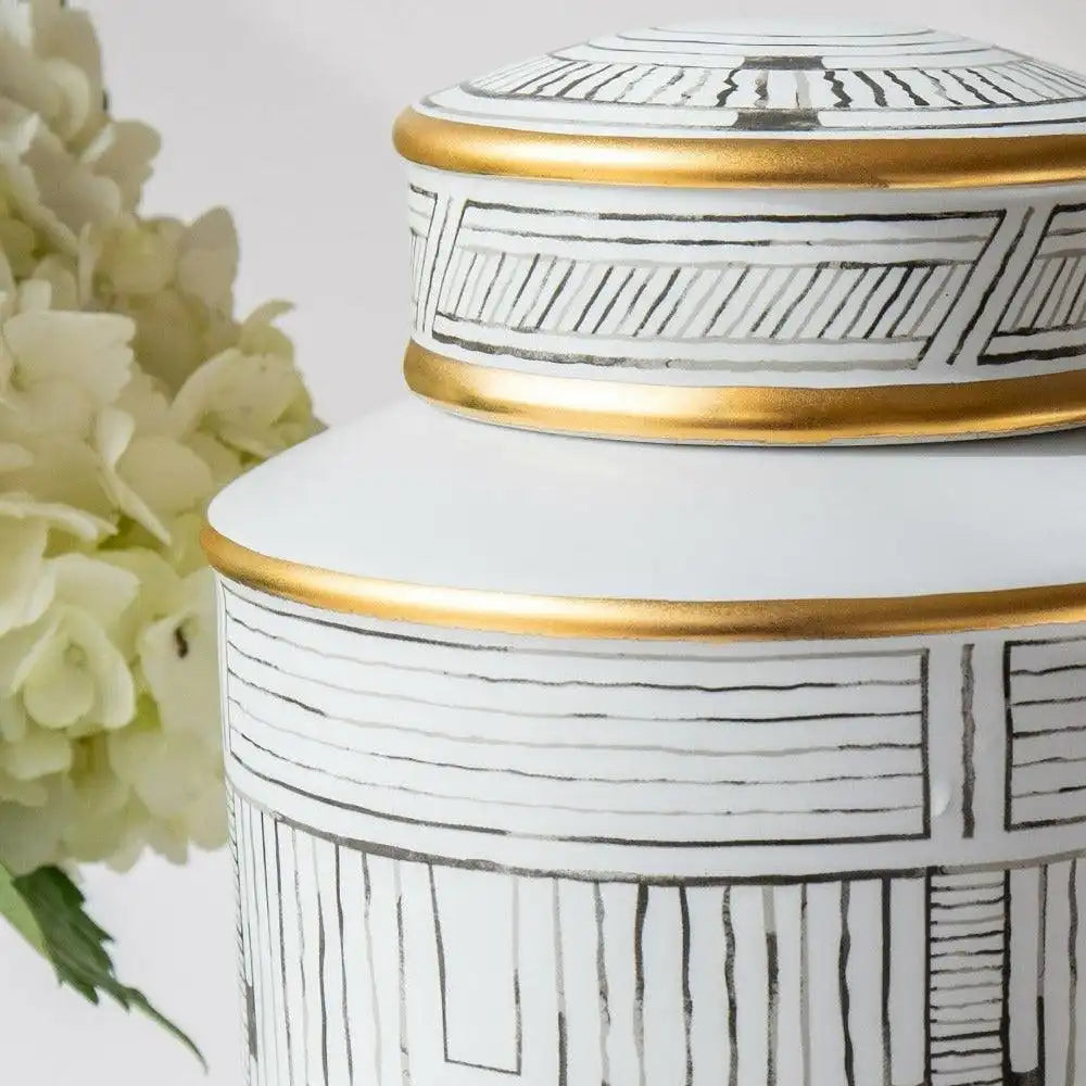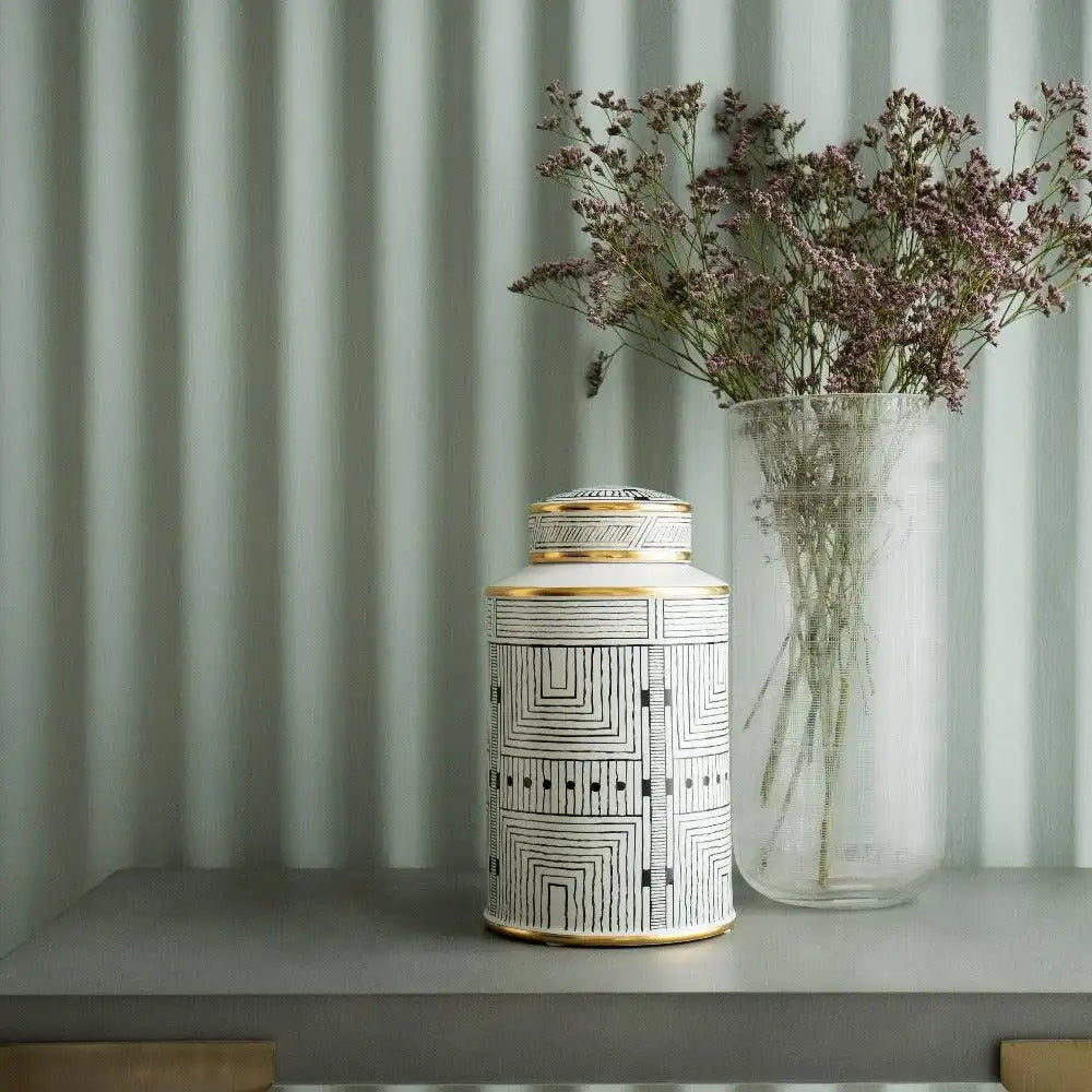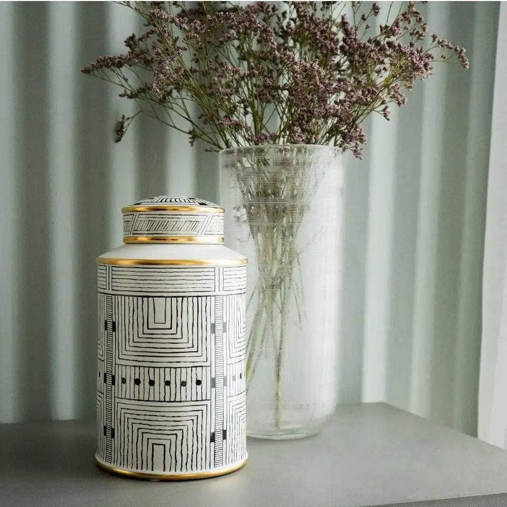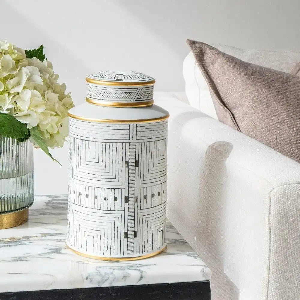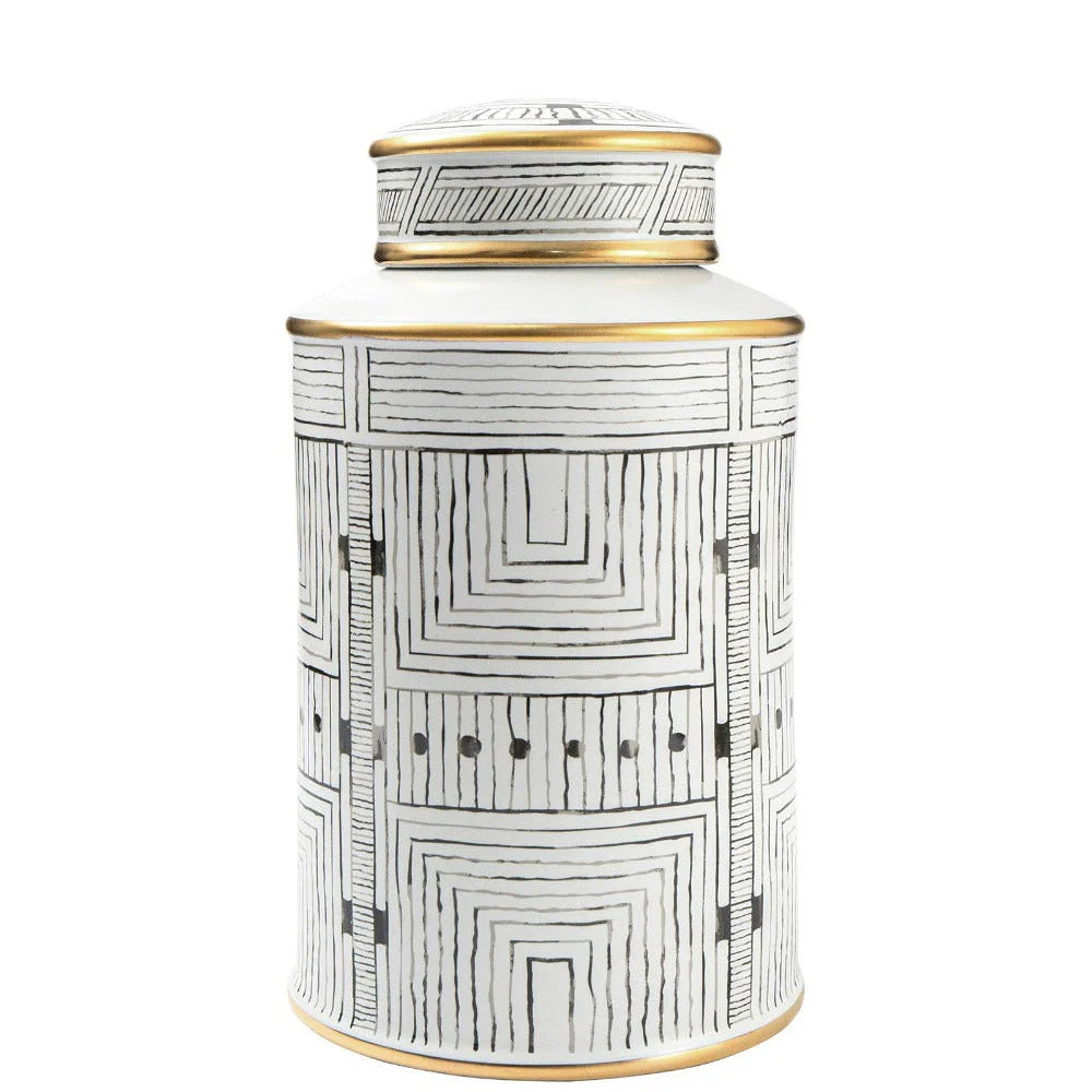 التصميم: علبة بورسلين باللونين الأسود والأبيض مع حافة ذهبية