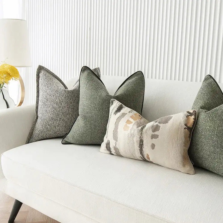 التصميم: وسادتان جاكارد، وسادتان جاكارد بحواف أنبوبية، ووسادة بتفاصيل تجريدية