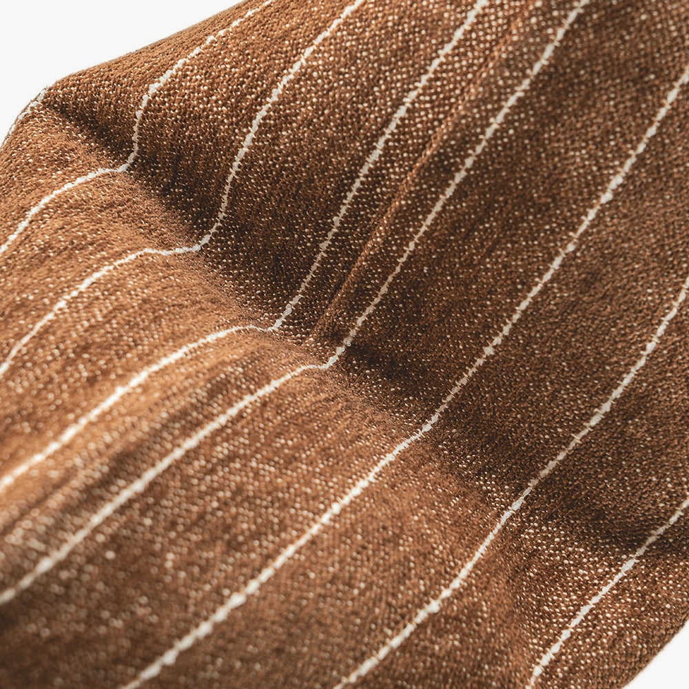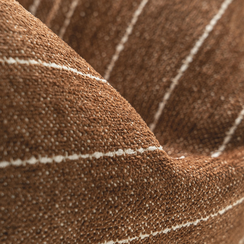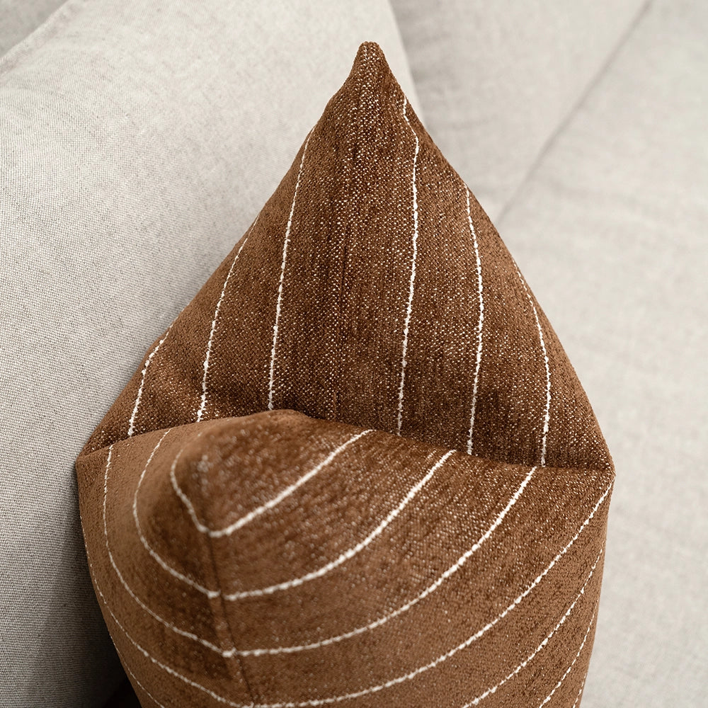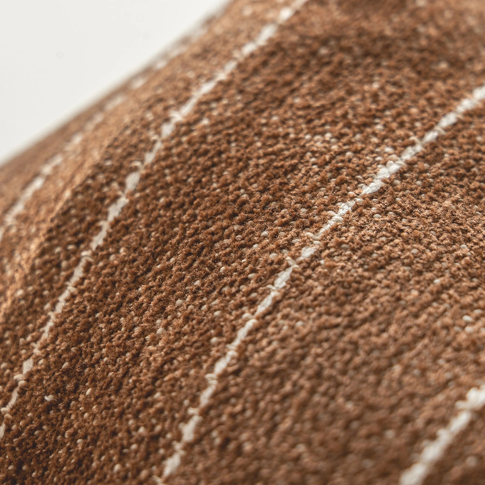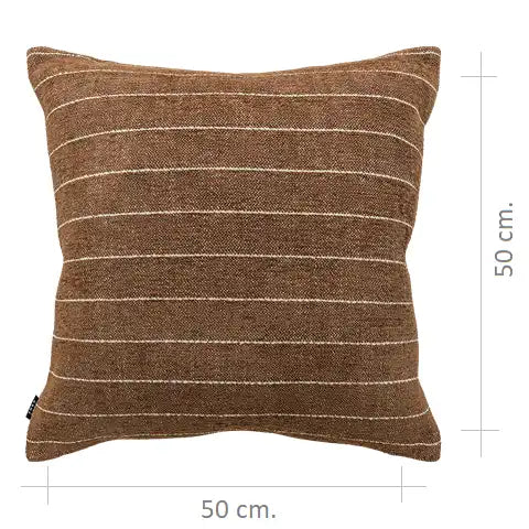 وسادة بلون بني دافئ مع لمسة خفيفة من اللون البني الغامق، مزينة بخطوط رفيعة باللون العاجي تمنحها تباينًا هادئًا. قماشها القطني الملمس يمنحها لمسة طبيعية ثابتة ومريحة وخالدة.