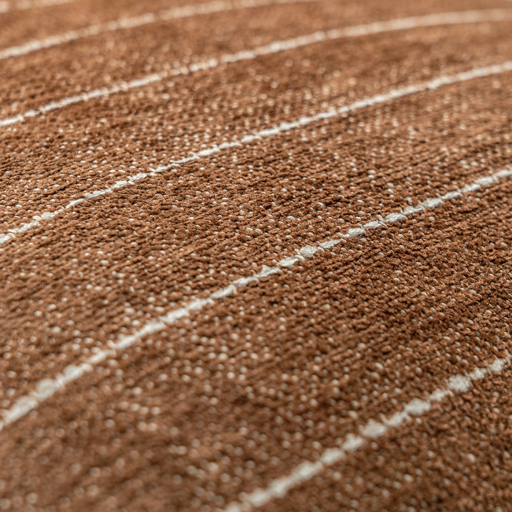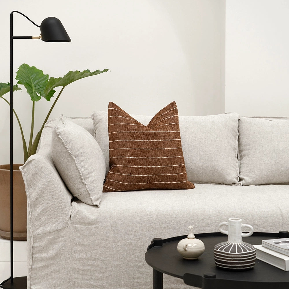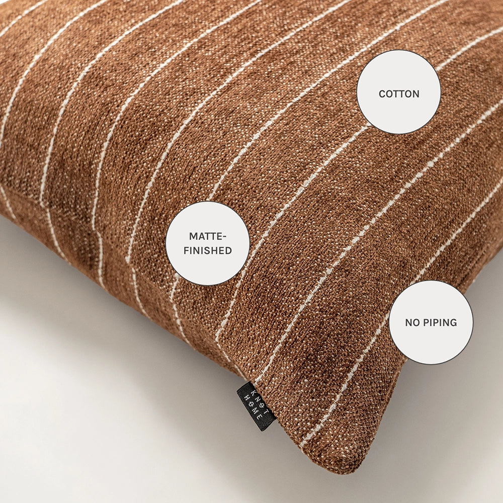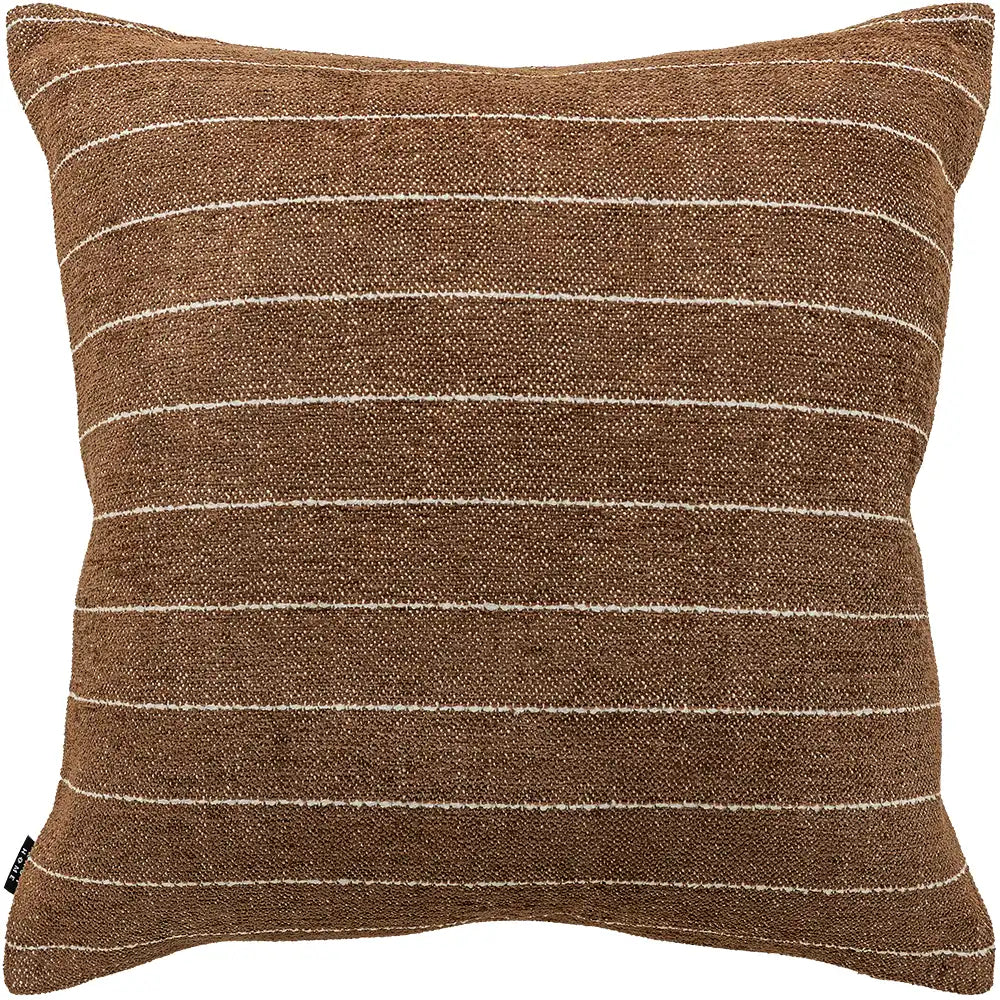 وسادة بلون بني دافئ مع لمسة خفيفة من اللون البني الغامق، مزينة بخطوط رفيعة باللون العاجي تمنحها تباينًا هادئًا. قماشها القطني الملمس يمنحها لمسة طبيعية ثابتة ومريحة وخالدة.
