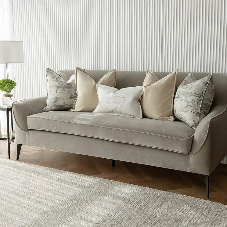 التصميم: وسادتان من المخمل باللون البيج، ووسادتان باللون الكريمي والرمادي، ووسادة من الجلد صناعي مع شكل حصان