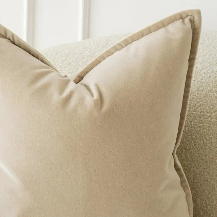 مجموعة تأتي بوسادتان من المخمل باللون البيج ووسادتان بنمط ثلاثي الأبعاد مع ظهر من المخمل.