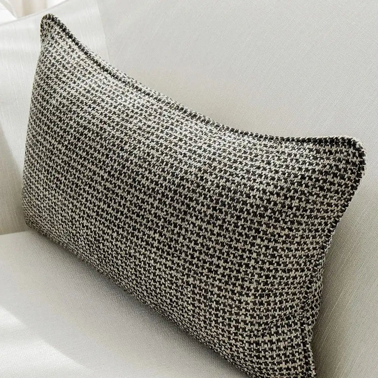 التصميم: وسادتان مخمليتان باللون البيج، ووسادتان رماديتان بنمط مميز، ووسادة بنمط المربعات باللونين الأسود والفضي