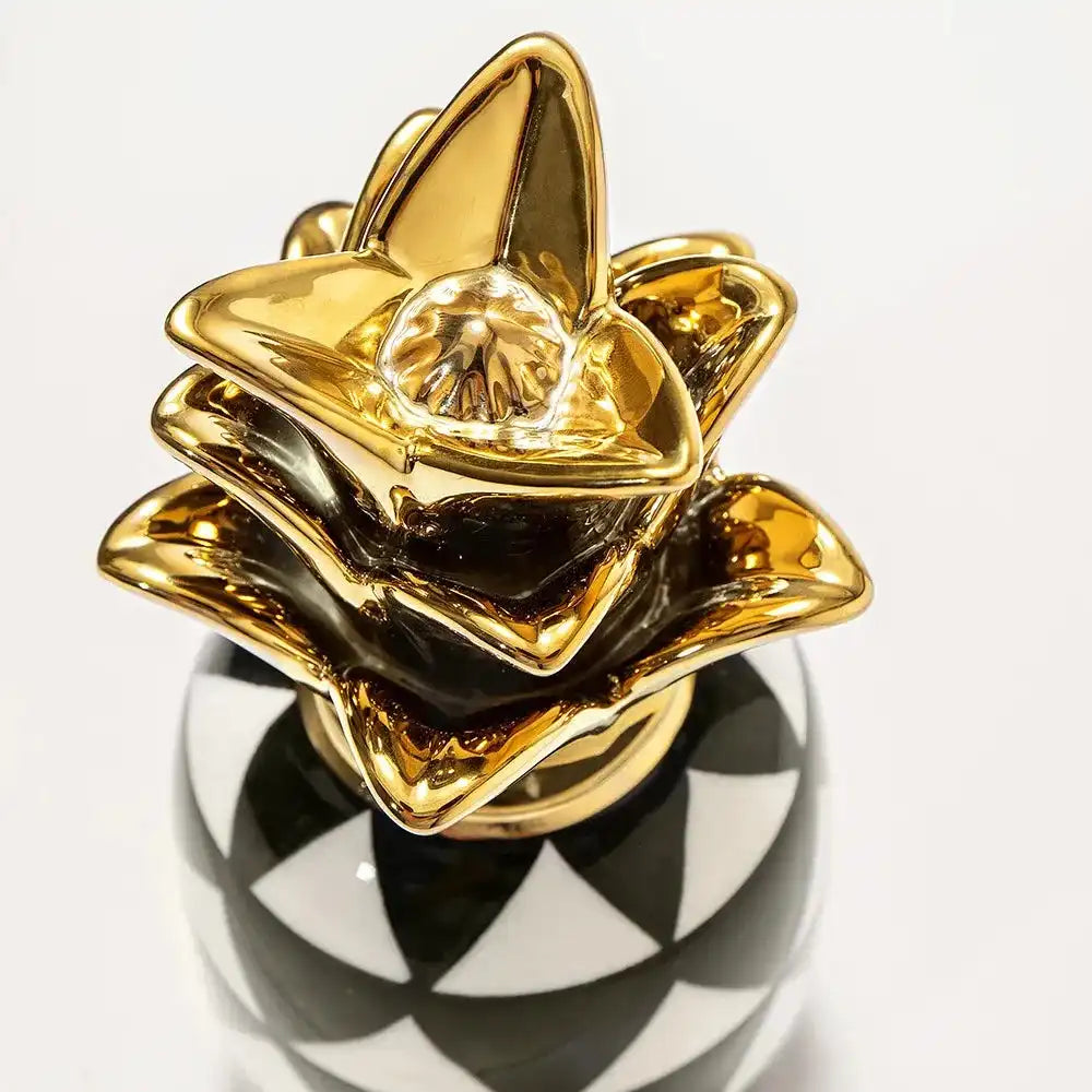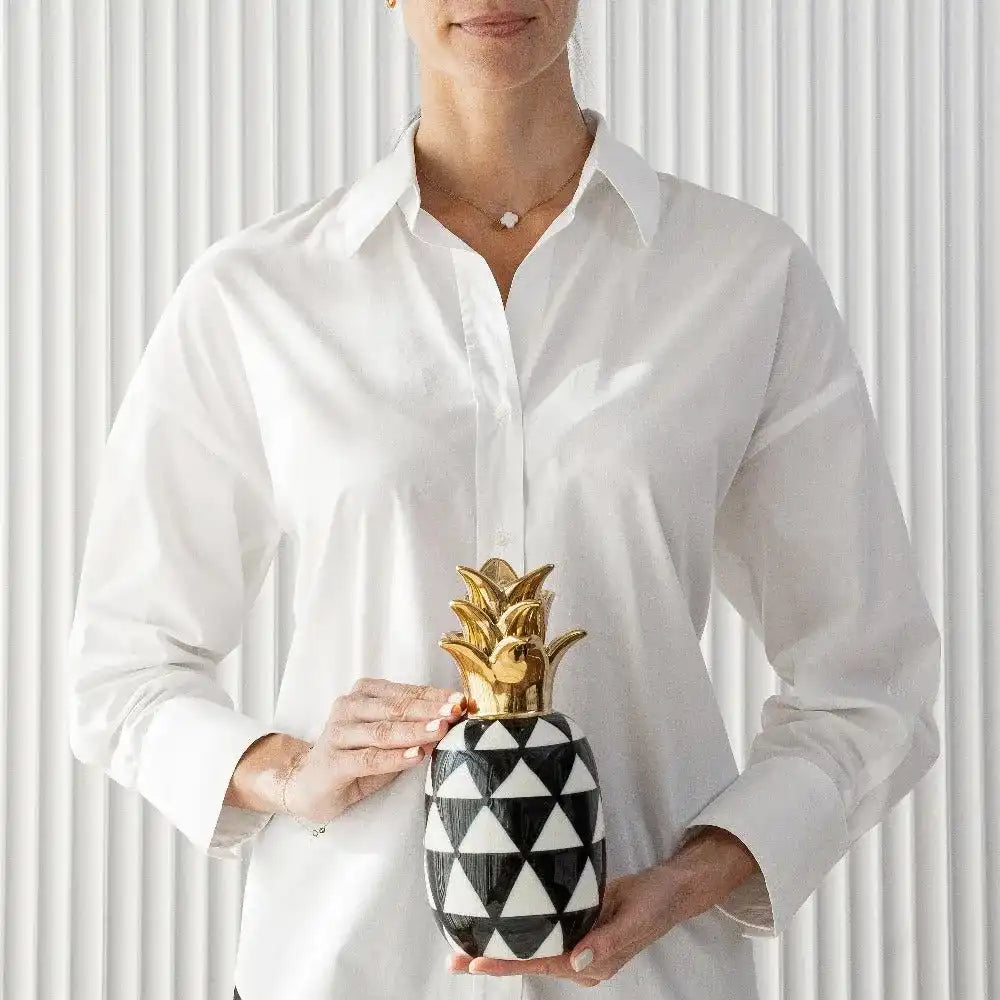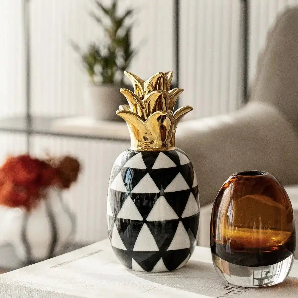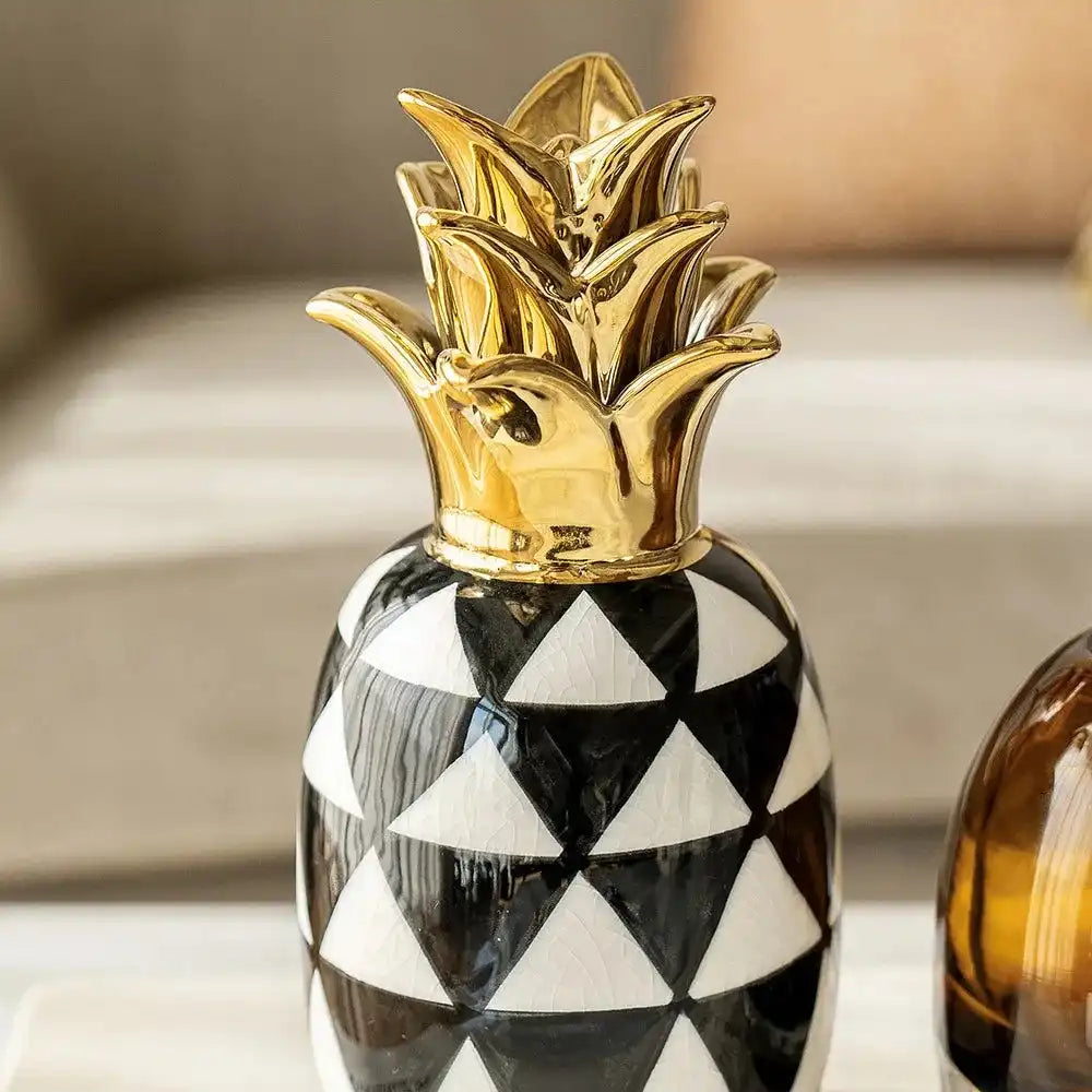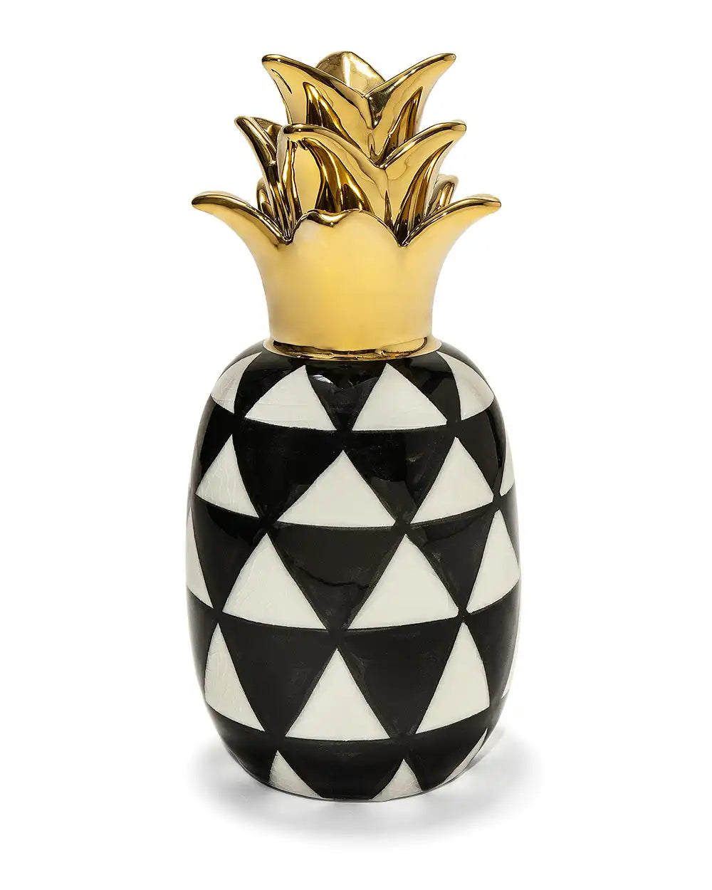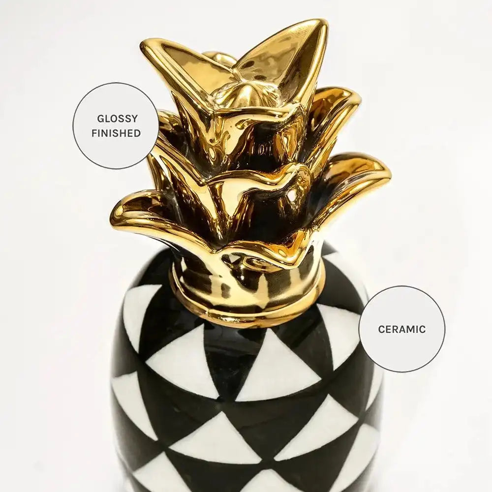 أنشئ أجواء ترحيبية مع منحوتة الأناناس مع نمط مثلث وأوراق ذهبية. تأتي بلمسة نهائية لامعة، للمزيد من الفخامة في غرفة المعيشة.