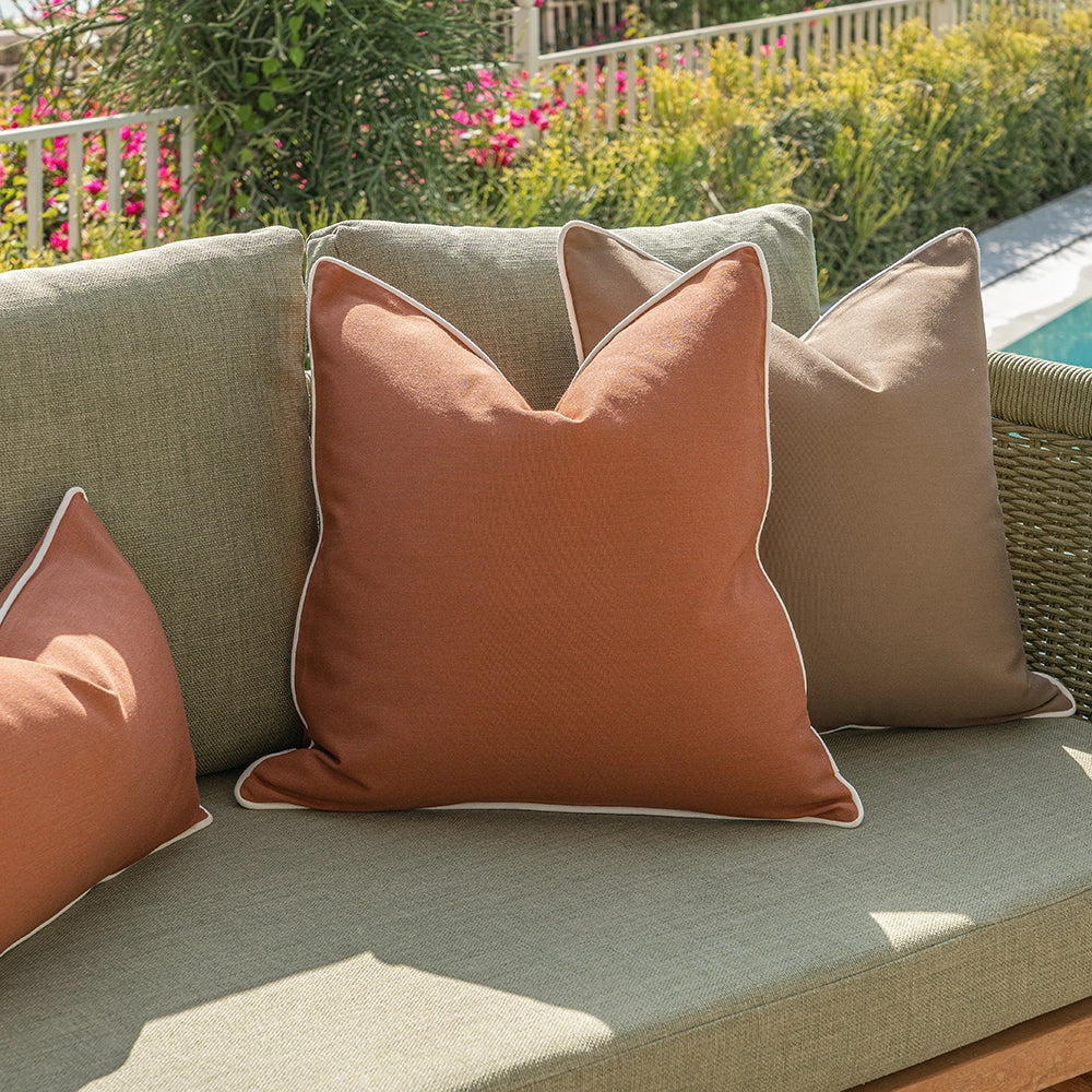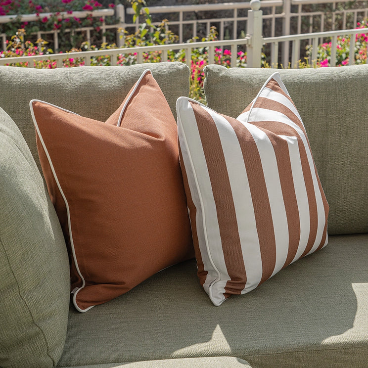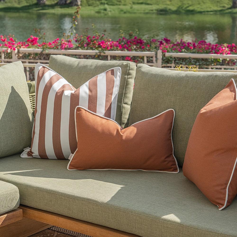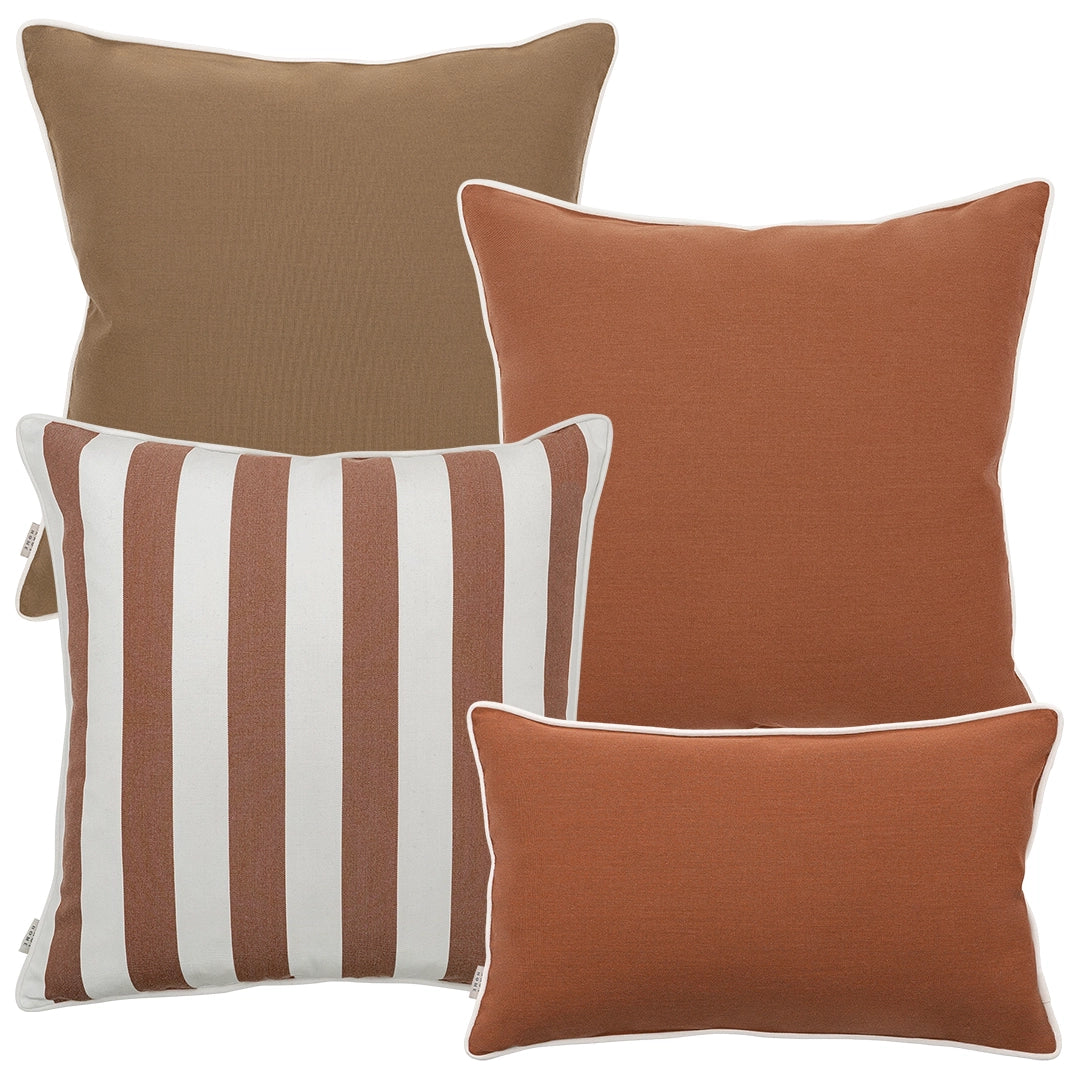 تأتي هذه المجموعة المكوّنة من أربع وسائد بدرجات ترابية من البني والأحمر الداكن، لتمنحك شعورًا دافئًا وجذابًا. تضيف الخطوط العريضة والحواف المتباينة لمسة عصرية وأنيقة للطقم الخارجي.